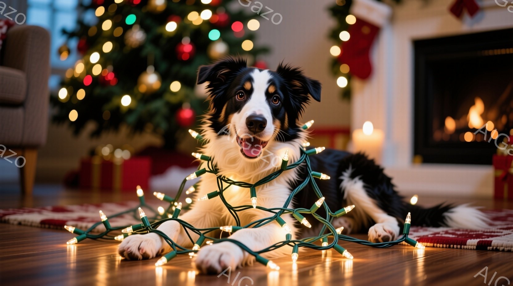 黒と白のボーダーコリーが、クリスマスツリーの足元にある床に横たわり、カラフルな電飾に体を巻き付けられています。犬は口を開けて微笑んでおり、リラックスした様子が伺えます。背景には、暖炉の火とクリスマスツリーが飾られた、温かく居心地の良いリビングルームが広がっています。