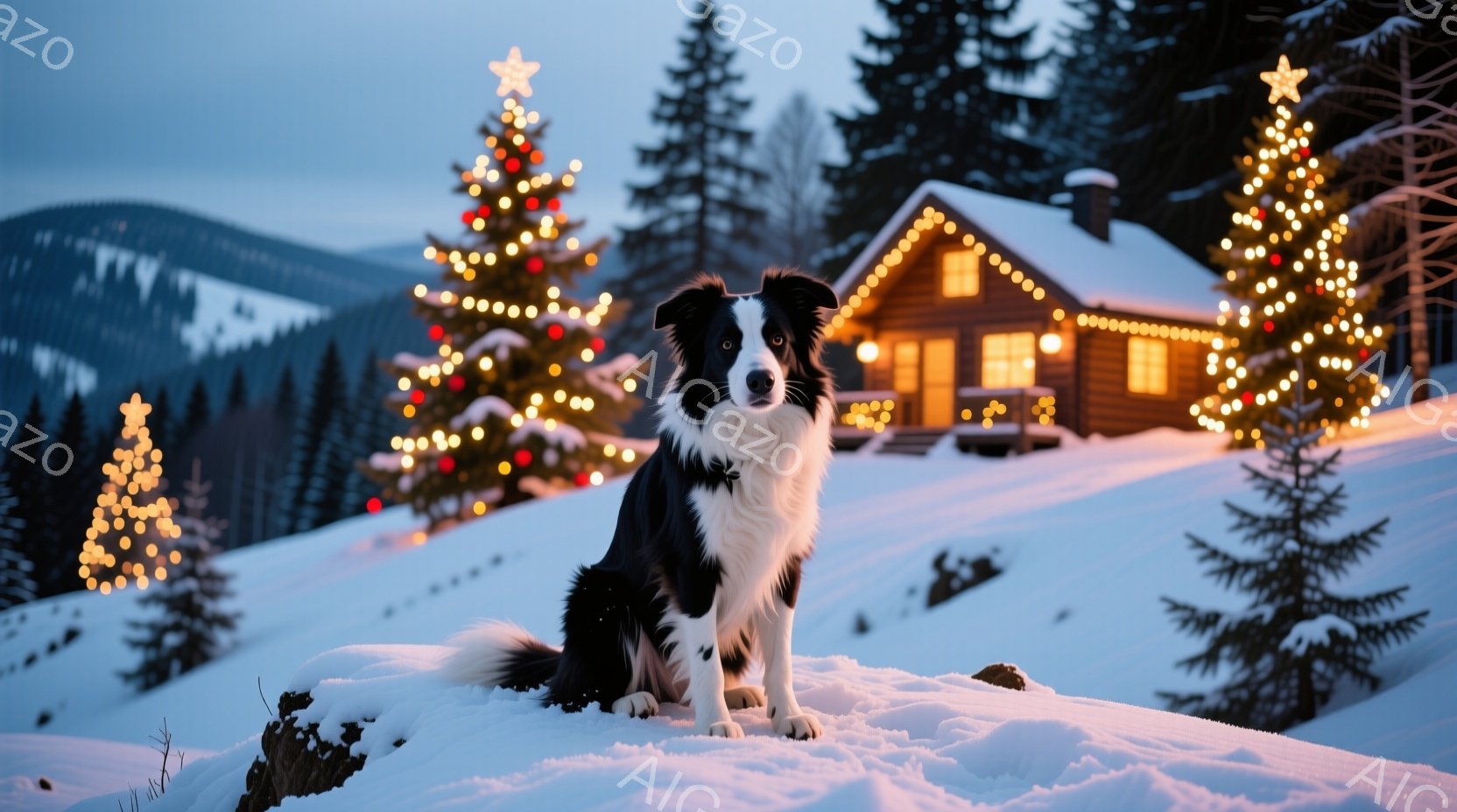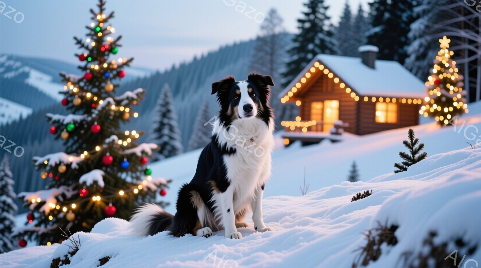 白と黒のボーダーコリーが雪の上に座っており、クリスマスの飾り付けがされたモミの木と、ライトアップされた木造の家が背景に見えます。犬は前方をまっすぐ見つめ、凛とした表情を浮かべています。背景には雪をまとった山々と、薄暗い空が広がり、冬の穏やかな雰囲気を醸し出しています。