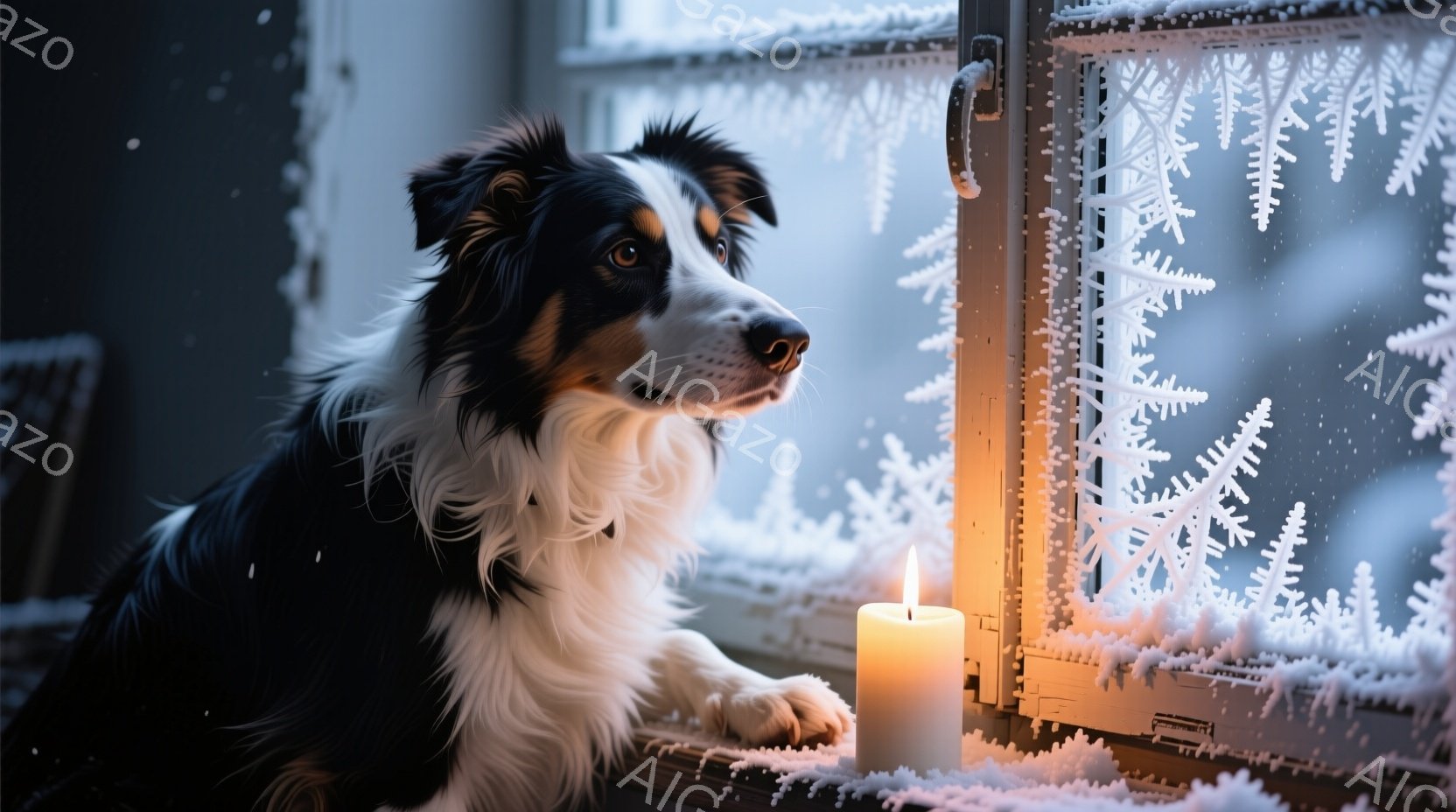 白黒のボーダーコリーが窓辺に座り、外を眺めている。窓ガラスには雪の結晶が描かれ、窓台には点灯したキャンドルが置かれている。全体的に冬の静寂と温かさを感じさせる、穏やかな雰囲気の画像である。