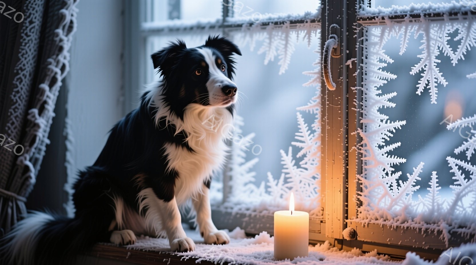黒と白のボーダーコリーが、窓辺に前足をかけて外を眺めている。窓には雪の結晶のような模様が描かれ、窓の外は雪景色で、薄暗い室内には一本のロウソクが灯っている。物静かで穏やかな冬の雰囲気が漂い、犬は少し物憂げな表情で遠くを見つめている。