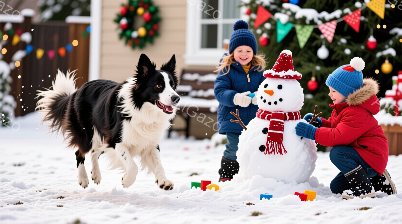 雪景色の中で、ピンクと黄色の防寒着を着た二人の子供が雪だるまを作っています。片方の子供はピンクの帽子と手袋を着用し、雪だるまに赤いマフラーを巻いており、もう片方の子供は黄色の帽子とジャケットを着て、小さなバケツで雪を集めています。背景にはクリスマス装飾が施された家と雪で覆われた木々が見え、元気な黒い犬が駆け寄って楽しんでいる様子が、暖かく幸せな冬の雰囲気を演出しています。