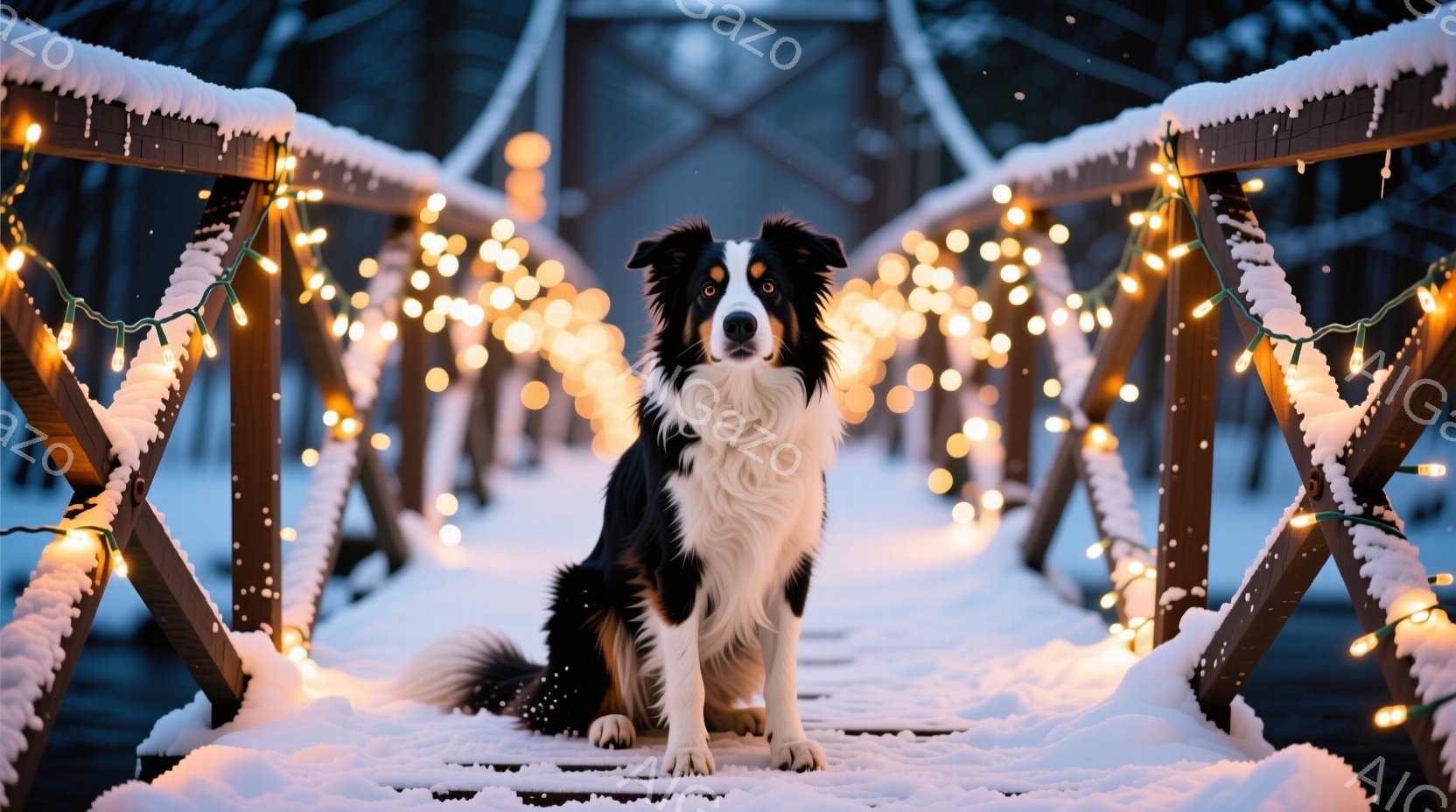 白黒のボーダーコリーが雪に覆われた木製の橋に座っており、首輪には金色のタグが付いています。背景にはぼやけた木々が見え、橋には温かい光を放つ無数の電飾が飾られています。全体として、冬の暖かく穏やかな雰囲気が漂う、可愛らしい光景です。