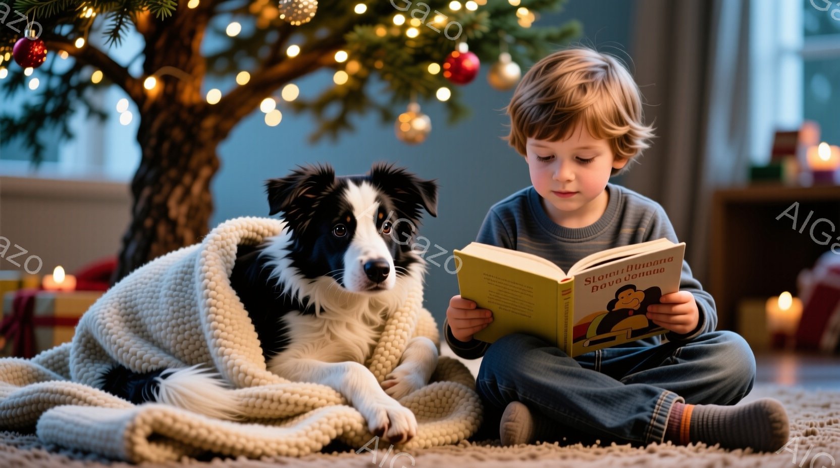 少年はニットセーターとブーツを履き、膝を曲げて芝生に座り、本に集中して読みふけっています。そばには、黒と白のボーダーコリーが、大きな編み物のブランケットの上に横たわり、穏やかな表情で少年のそばに寄り添っています。背景にはぼやけた家屋と木々、そして夕暮れ時の柔らかい光が広がり、温かく穏やかな雰囲気を醸し出しています。
