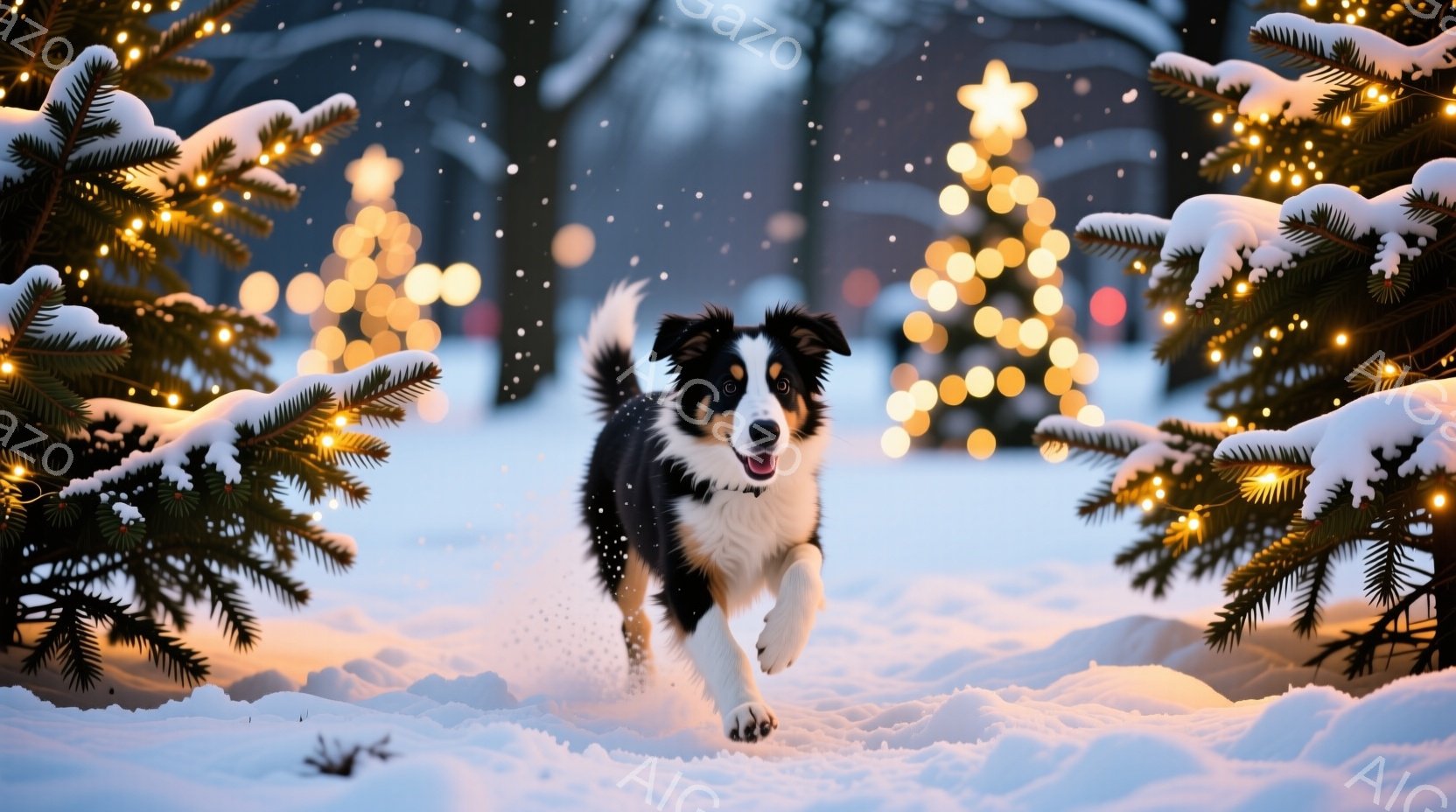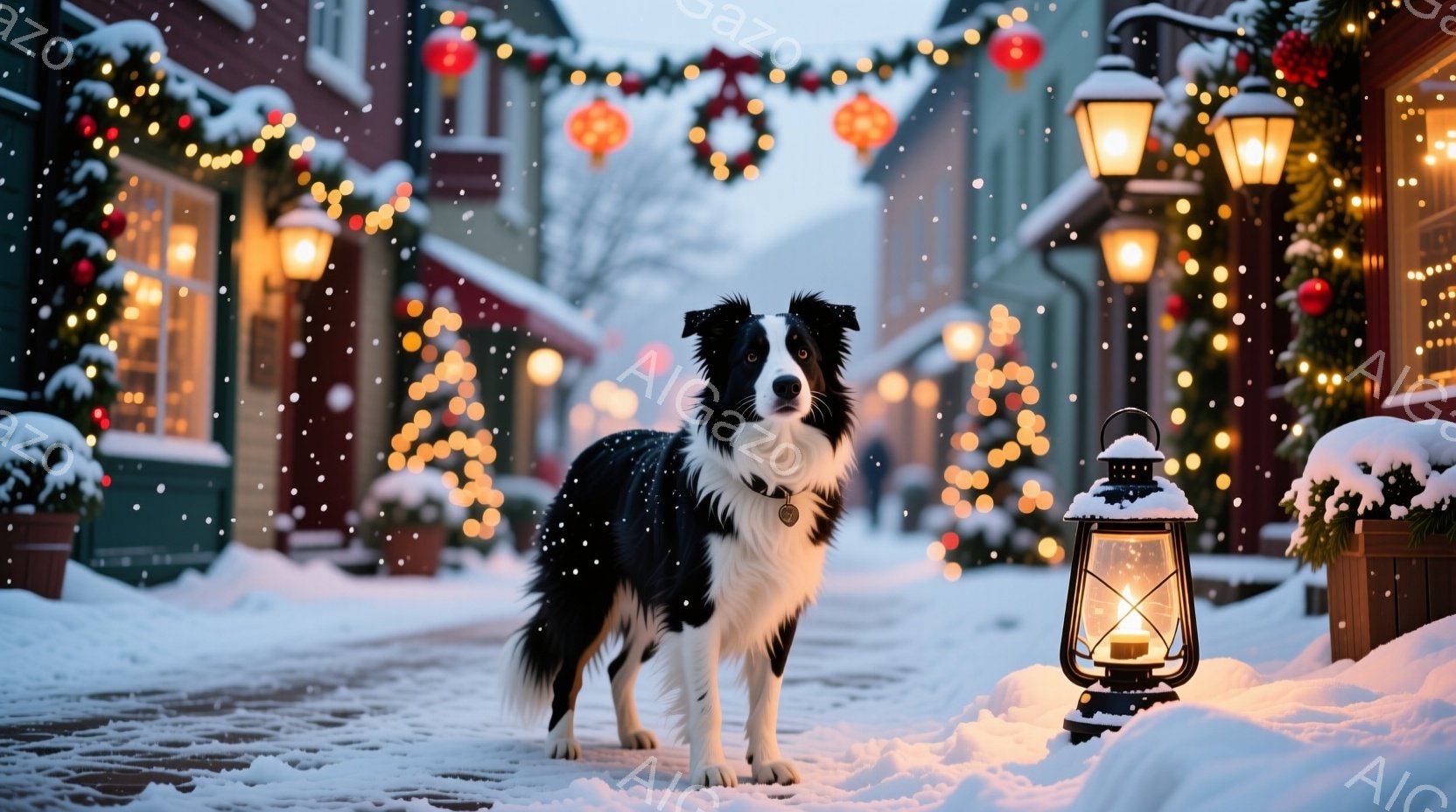 白と黒のボーダーコリーが雪の積もった石畳の道に立っている。背景には、クリスマスイルミネーションで飾られた建物が並び、雪が舞っている様子が描かれている。温かい光が辺りを照らし、冬の穏やかで祝祭的な雰囲気を醸し出している。