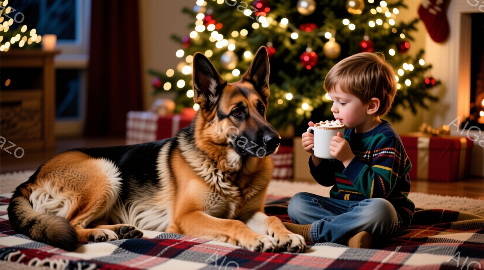 暖炉のある部屋で、小さな男の子が敷物の上に座り、ホットココアのような飲み物を楽しんでいます。彼は赤いセーターとジーンズを着ており、金髪で少し巻いた髪をしています。横には、毛並みの美しいジャーマンシェパードが横たわり、男の子を見つめており、背景にはクリスマスツリーとプレゼントが飾られています。