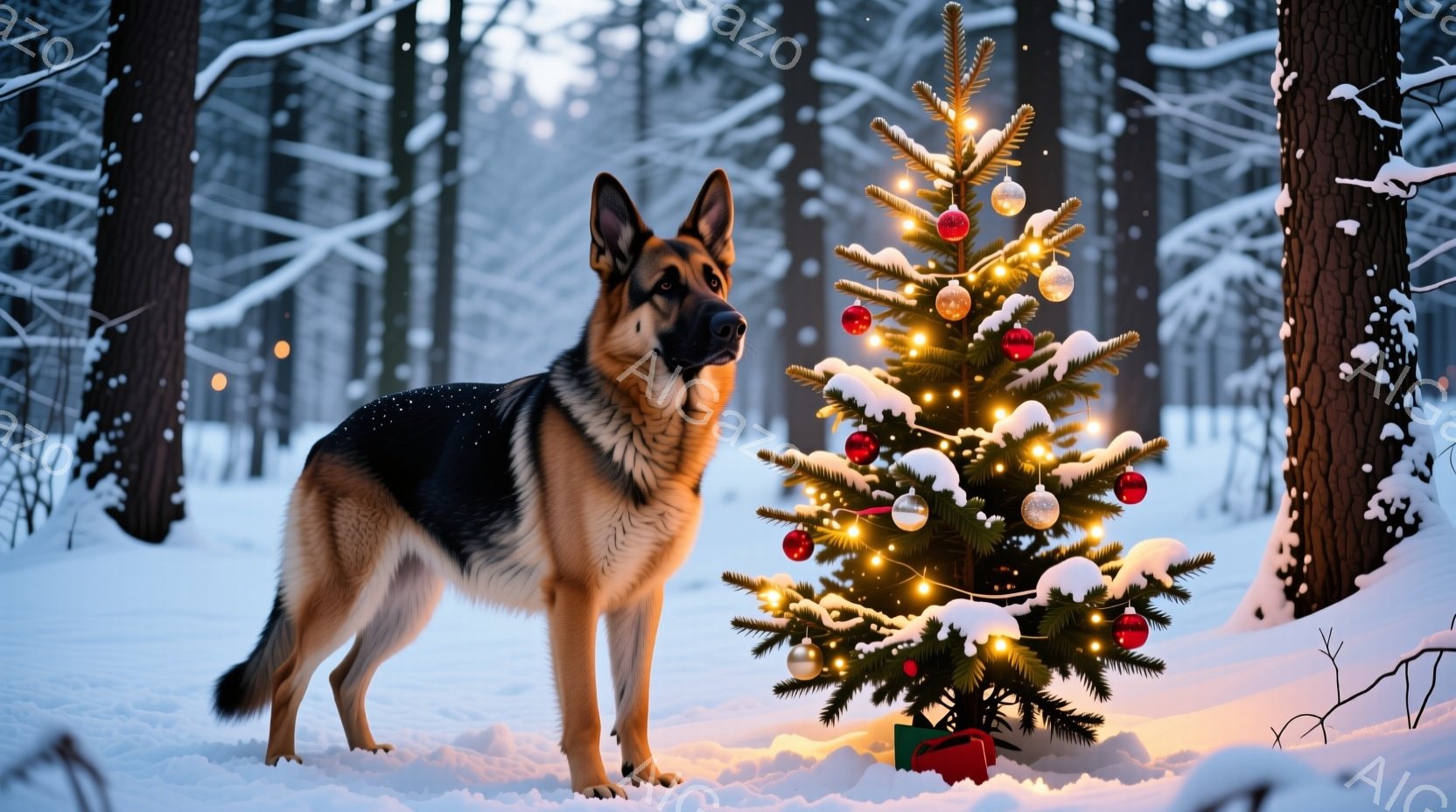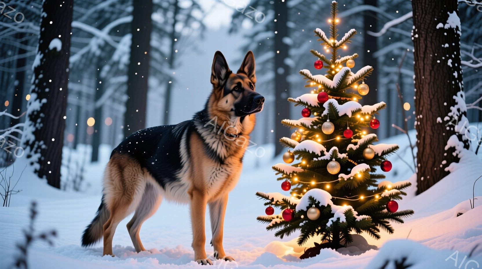 雪景色の中で、ジャーマンシェパードがクリスマスツリーの横に立っている。ツリーは暖色のライトと赤いオーナメントで飾られ、雪化粧をまとう木々と暖かく光るツリーがコントラストをなしている。犬は遠くを見つめ、静かで穏やかな冬の雰囲気を醸し出している。
