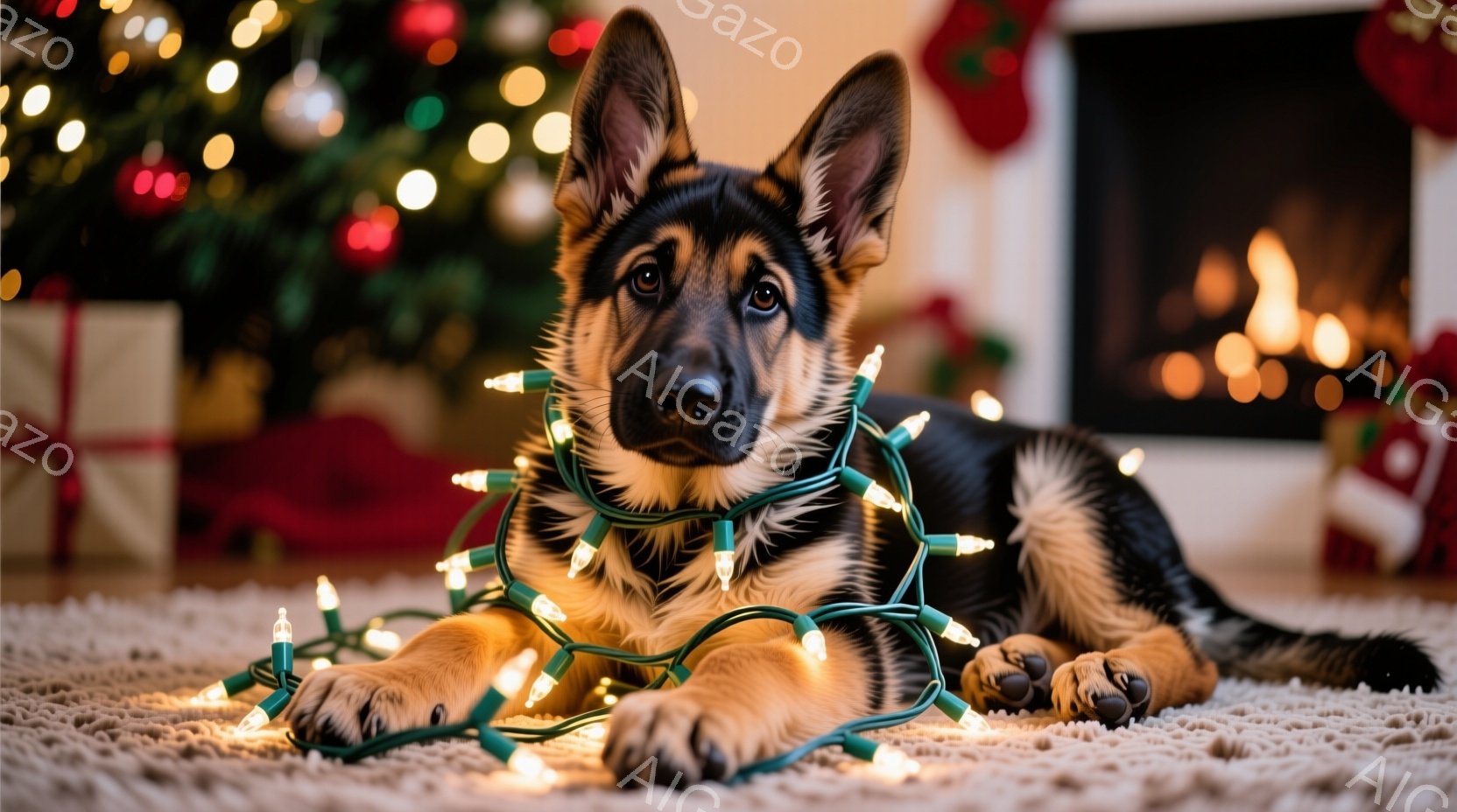 鮮やかなクリスマスツリーを背景に、ジャーマンシェパードの子犬がカーペットの上に横たわっています。子犬はクリスマスライトにからまり、リラックスした表情でカメラを見つめており、暖かく、お祝いの雰囲気を感じさせます。背景には暖炉とクリスマスデコレーションがあり、冬のホリデーシーズンを象徴する光景です。