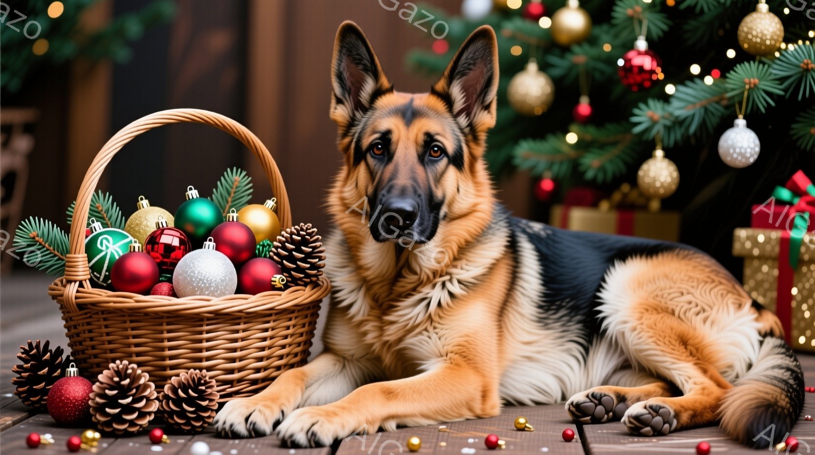 クリスマスツリーの背景に、茶色と黒のジャーマンシェパードが横たわっている様子が写っています。その隣には、赤、緑、金色のボールや松ぼっくりでいっぱいの籐のバスケットが置かれており、雪が薄く降り積もっているようです。全体的に、暖かく、お祝いの雰囲気で、犬がリラックスした様子が伝わってきます。