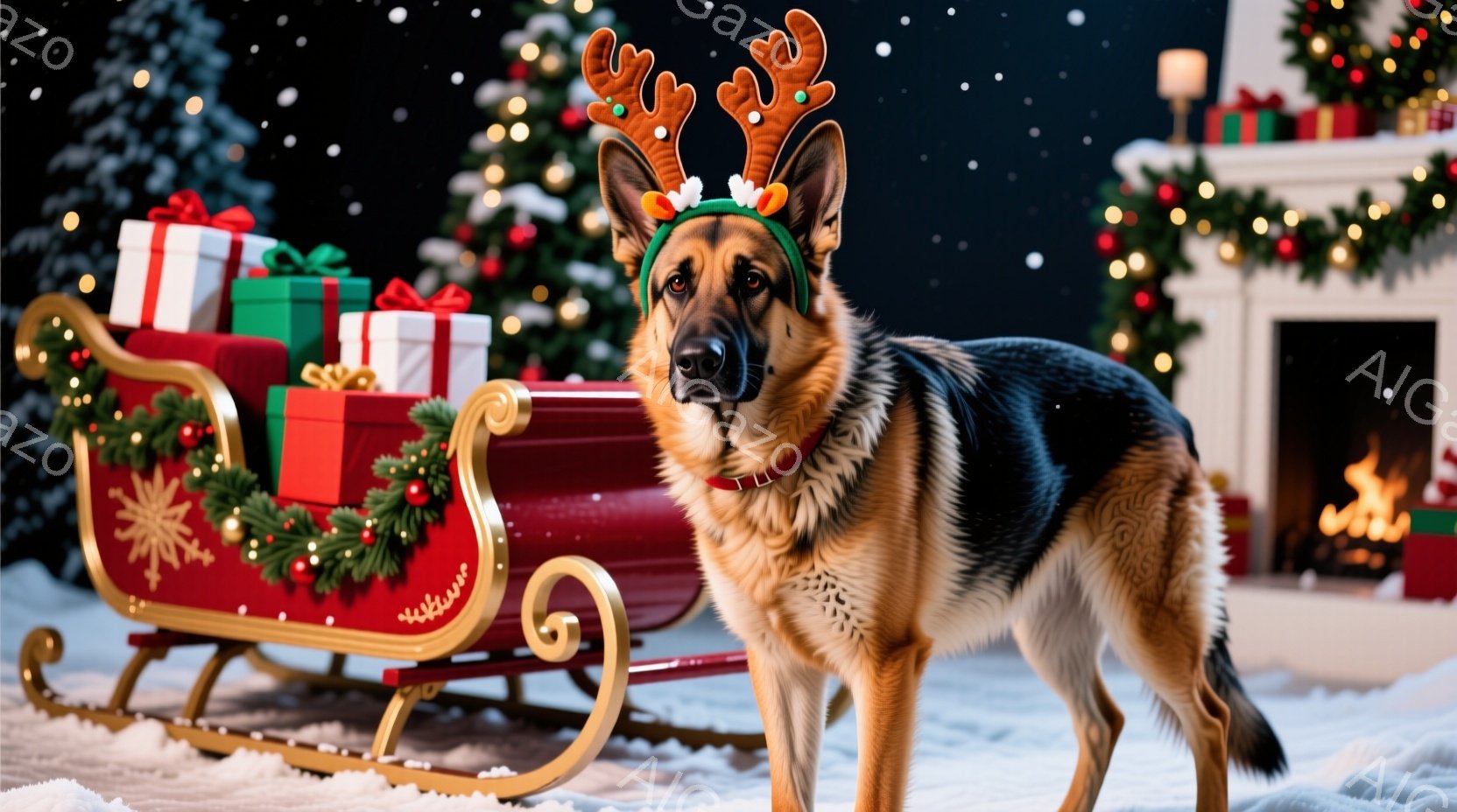 クリスマスツリーの下に横たわるジャーマンシェパードが写っています。犬はリラックスした様子で、茶色と黒の毛並みが美しく、落ち着いた表情をしています。背景にはカラフルなプレゼントボックスが積み重ねられ、クリスマスの華やかな雰囲気を醸し出しています。