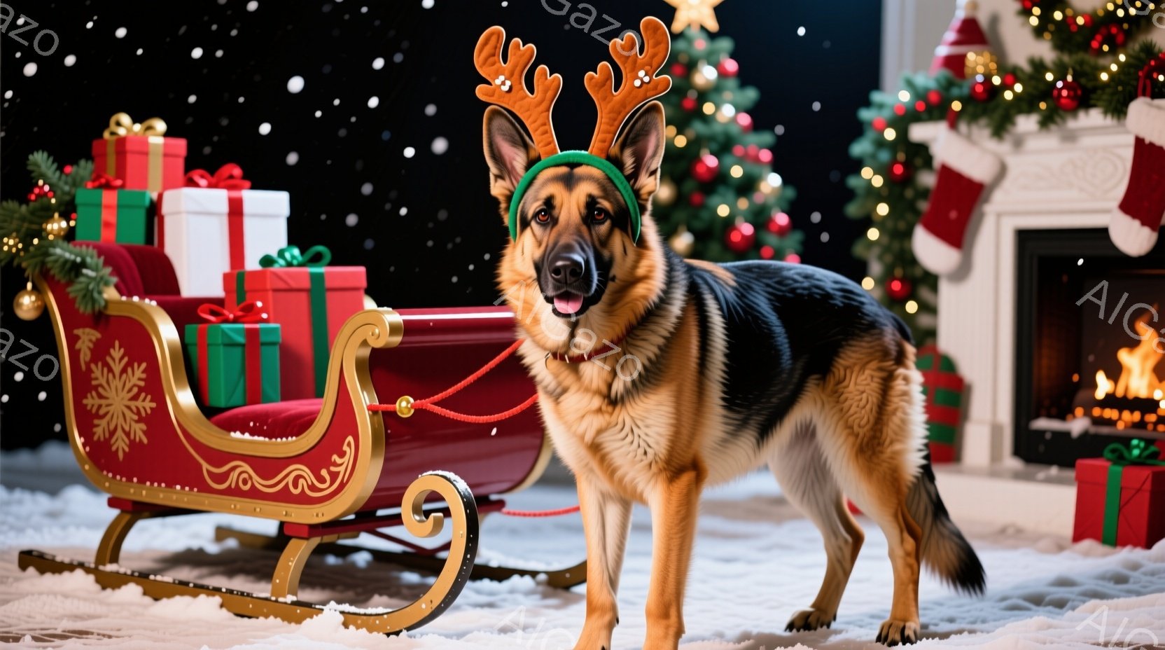 クリスマスをテーマにしたシーンが写っています。ジャーマンシェパードがトナカイの角のヘッドバンドを装着し、雪の上に置かれた赤いそりに寄りかかっています。背景には、クリスマスツリーやカラフルなプレゼントボックスが散りばめられ、雪が舞い降りる幻想的な雰囲気を醸し出しています。