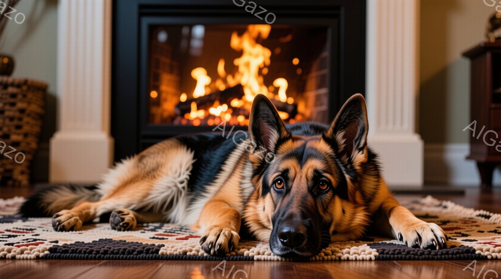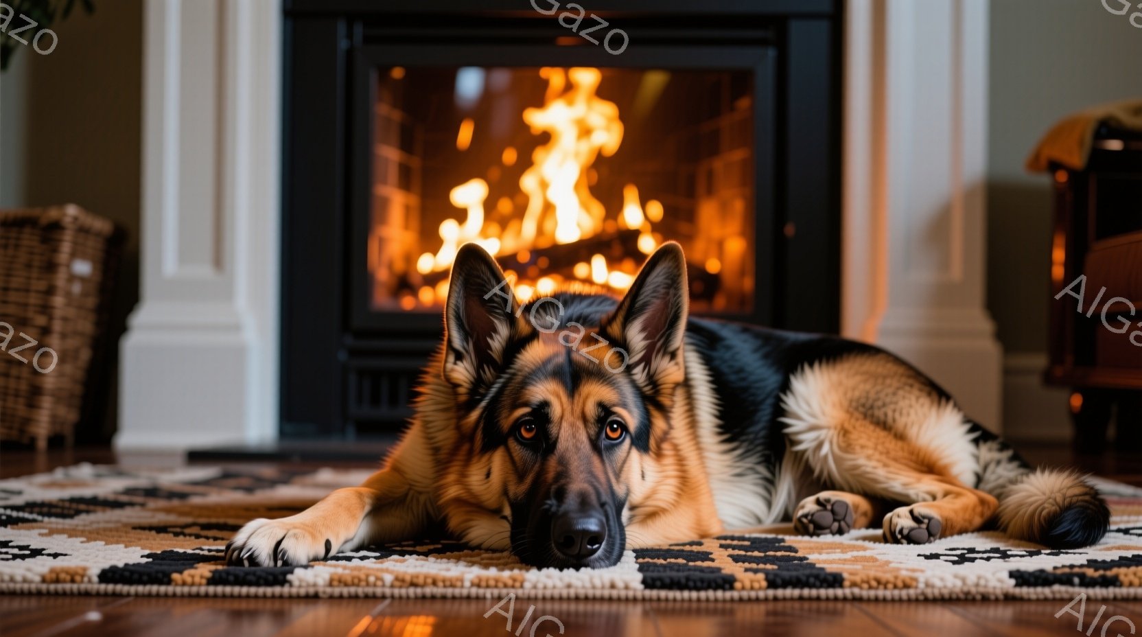 暖炉の前に敷かれたカラフルなラグの上に、ジャーマンシェパードが横たわっています。犬はリラックスした様子で、正面をまっすぐ見つめており、落ち着いた表情をしています。背景には白く装飾された暖炉があり、暖かく心地よい雰囲気が漂っています。