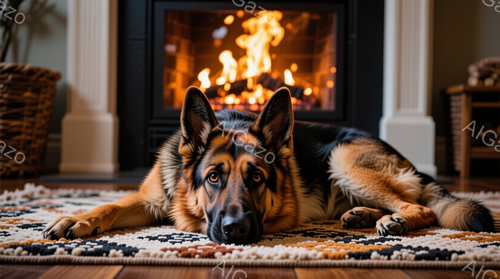 暖炉の前で、ドイツシェパードが絨毯の上で横たわっています。犬は落ち着いた表情で、正面を見つめており、リラックスした様子が伺えます。背景には暖炉があり、炎が燃え盛っており、暖かく居心地の良い雰囲気を作り出しています。