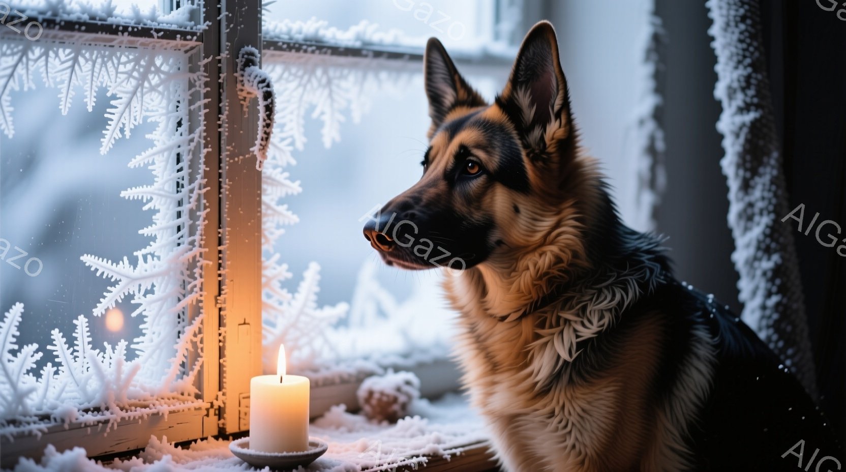 雪景色の中で、茶色と黒のジャーマンシェパードが飛び跳ね、楽しそうに雪だるまに近づいています。少年は青いジャケットと帽子を着用し、笑顔で雪だるまの顔に人参の鼻を取り付けようとしています。背景には木々が立ち並び、降り積もる雪が冬の温かく幸せな雰囲気を演出しています。
