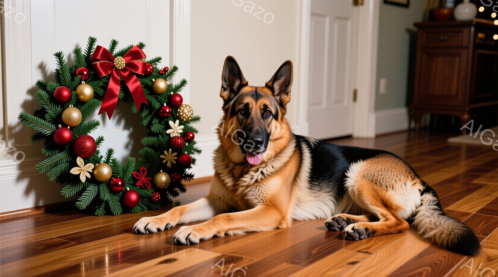 明るい木の床に、ジャーマンシェパードが横たわっています。背景にはクリスマスリースがあり、赤い飾りと金色のボールで飾られています。犬はリラックスした表情で、まっすぐにカメラを見ています。