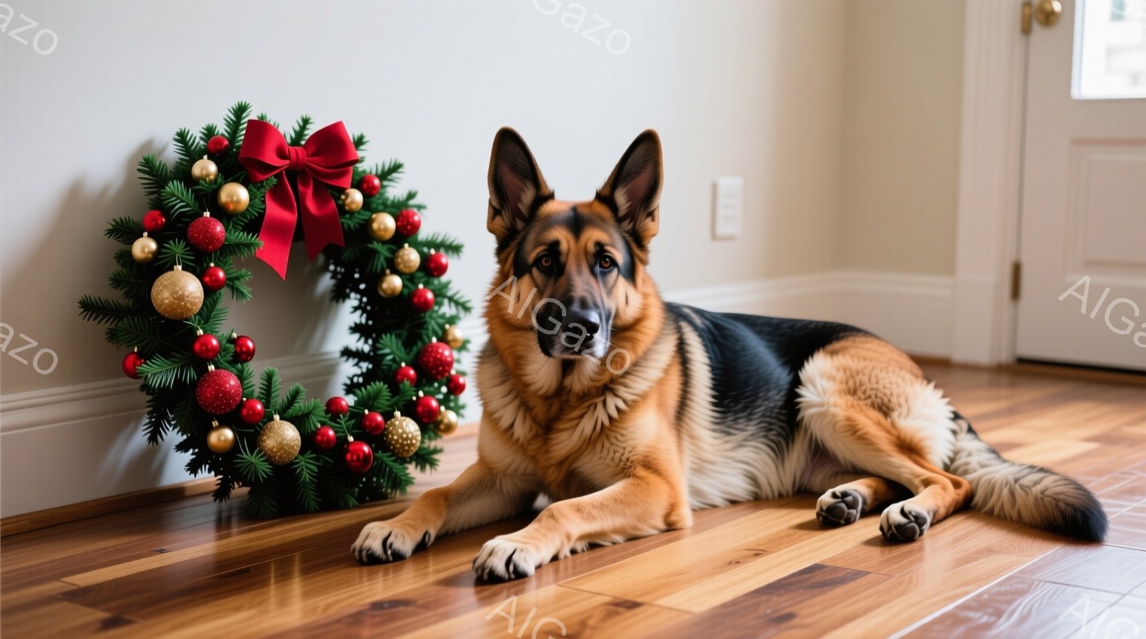 雪に覆われた木製の橋の上に立つジャーマンシェパードが写っています。犬は正面をまっすぐ見つめ、落ち着いた表情で立っており、冬の風景と温かい光のイルミネーションが、穏やかで幻想的な雰囲気を醸し出しています。背景には雪景色が広がり、暖色の光が木々の間から差し込み、冬の寒さを和らげるような印象を与えます。