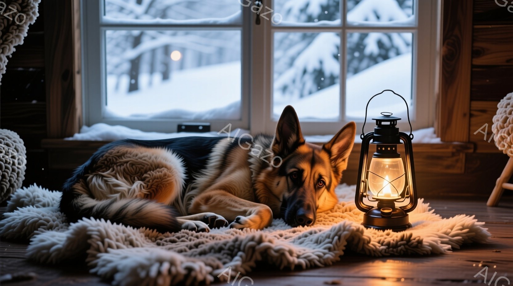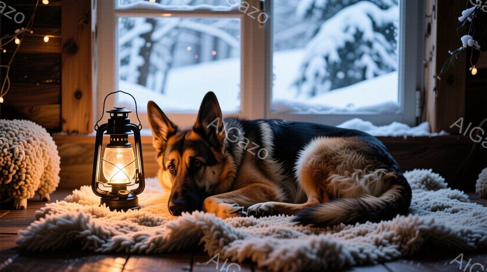 暖炉の光が灯る室内で、ジャーマンシェパードがふわふわのラグの上に横たわっています。窓の外には雪景色が広がり、室内との暖かさのコントラストが際立っています。犬はリラックスした表情で、穏やかで静かな雰囲気を醸し出しています。