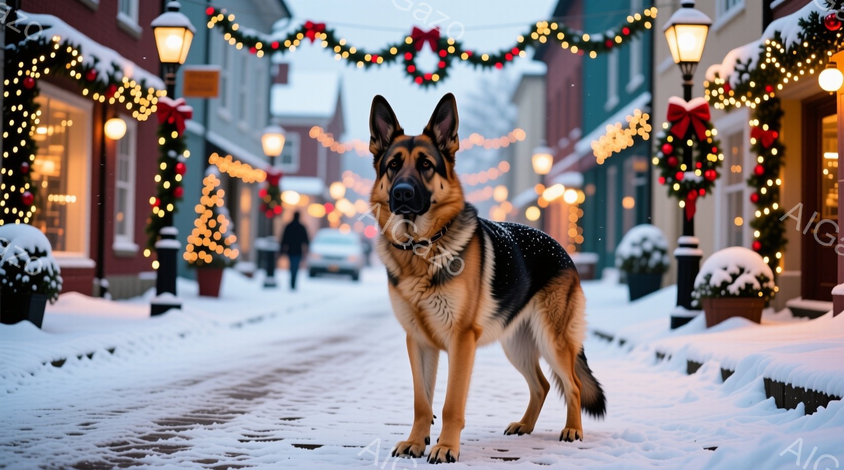 雪が降る街中に、ジャーマンシェパードが正面を向き、凛々しく立っている。背景には、クリスマス装飾が施された建物が並び、暖かく華やかな雰囲気を醸し出している。雪景色と街灯の光が、冬の温かい季節感を演出している。