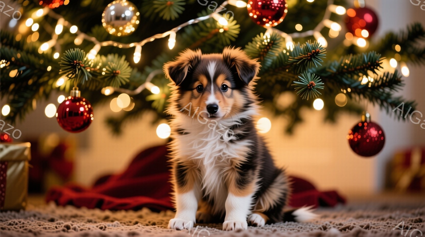 小さなシェットランドシープドッグの子犬が、カーペットの上に座ってこちらを見ています。背景には、飾り付けられたクリスマスツリーとプレゼントの箱がぼんやりと見え、温かく幸せな雰囲気を醸し出しています。子犬は丸い目をしており、愛らしくて無邪気な表情をしています。