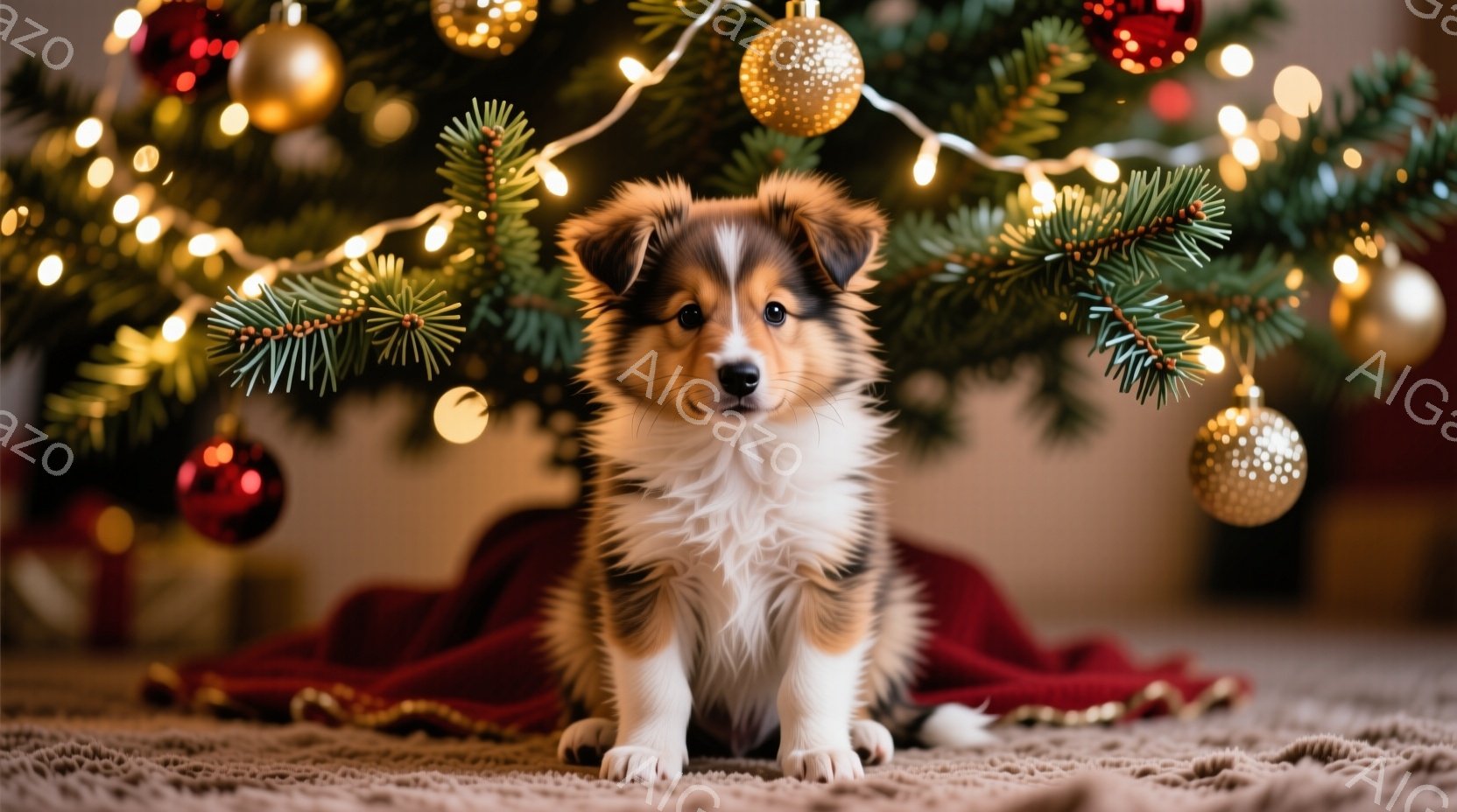 ふわふわの茶色と白の毛並みを持つコリーの幼犬が、赤い布の上に座って正面を見つめている。背景にはクリスマスツリーが飾られており、温かい光が幼犬を照らし、クリスマスの雰囲気を演出している。全体的に暖かく、愛らしい雰囲気で、幼犬のつぶらな瞳が印象的だ。