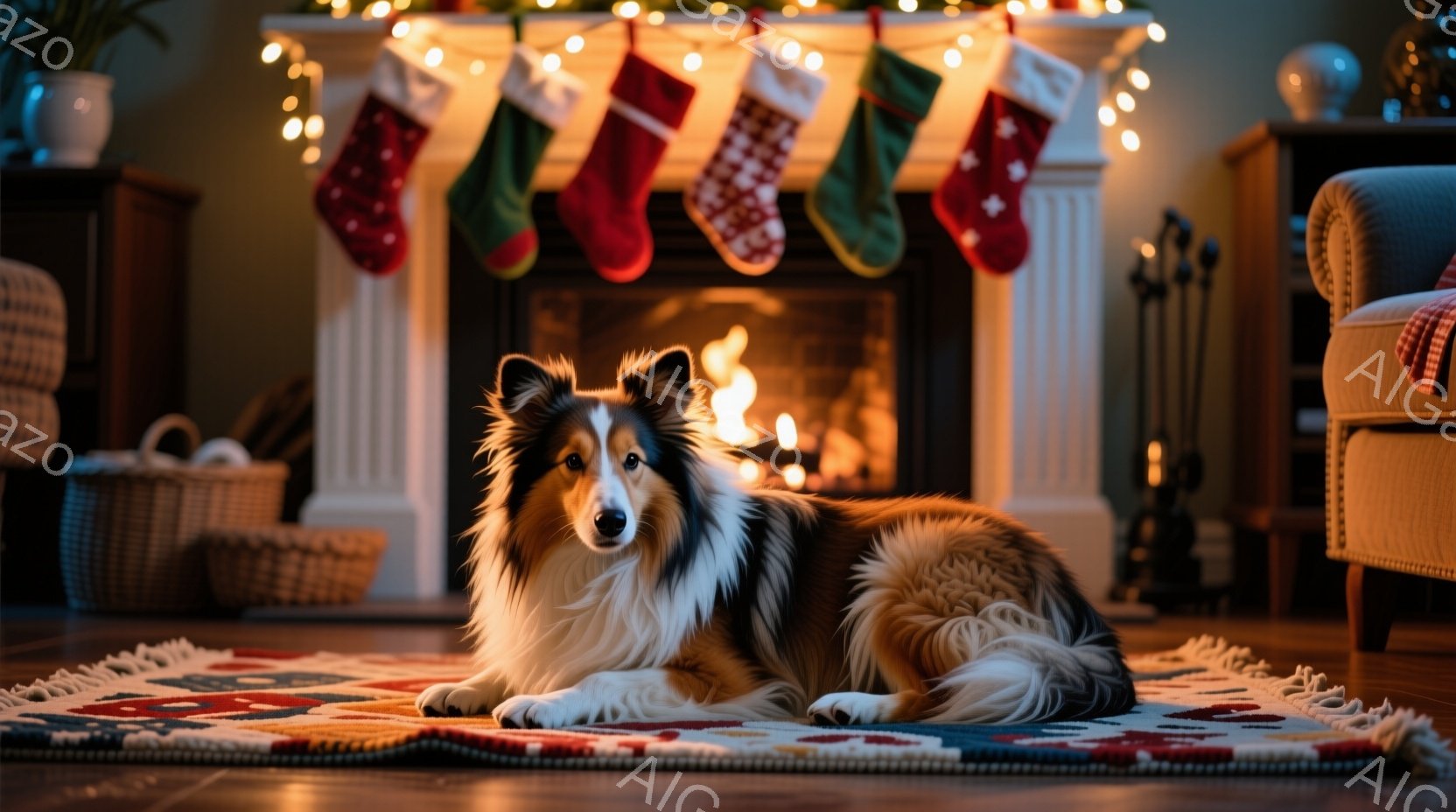 長毛のコリー犬が、毛糸のような敷物の上でリラックスして横たわっています。背後には木製の壁と家具が見え、暖炉の光とテーブルランプが室内を照らし、温かく落ち着いた雰囲気を醸し出しています。犬は正面を向き、穏やかな表情でカメラを見つめており、室内全体が冬の暖炉の温かさを感じさせる空間となっています。