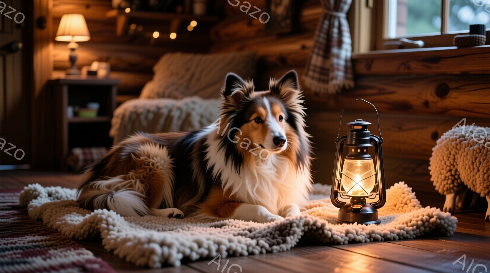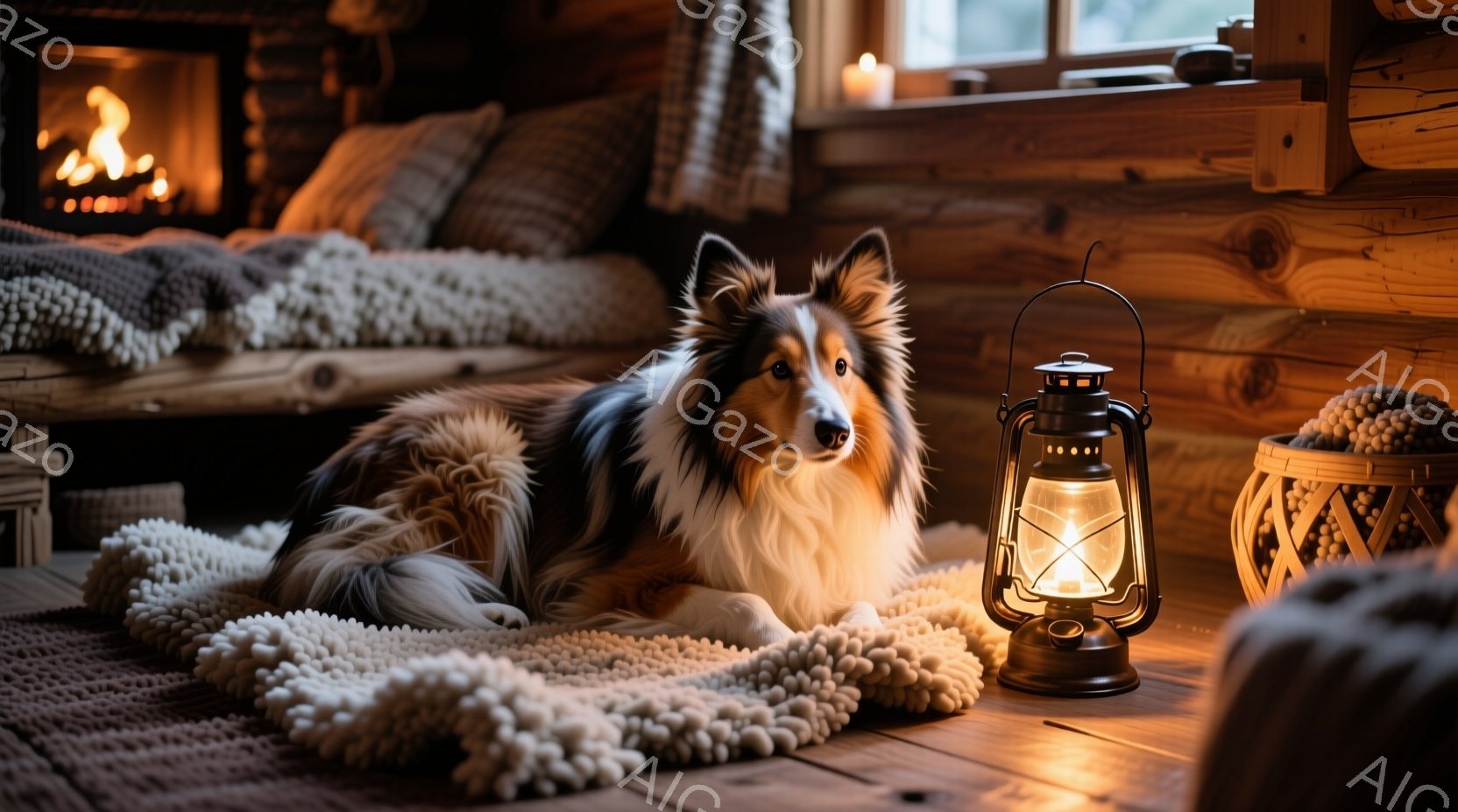 暖炉のある木造コテージの床に、美しい毛並みのシェットランドシープドッグがリラックスして横たわっています。犬の周りには、手編みの白いラグと、温かい光を放つ古いランタンが置かれ、室内は落ち着いた雰囲気に包まれています。背景には、装飾的な枕が置かれたソファが見え、全体的に暖かく心地よい空間が演出されています。