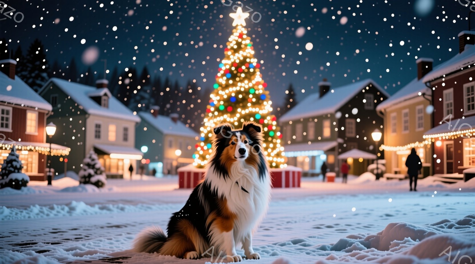 鮮やかなクリスマスツリーを背景に、美しいコリー犬が雪景色の中で座っています。犬は首輪をつけており、自信に満ちた表情で正面を見つめています。背景には、雪で覆われた建物が並び、クリスマスの飾り付けが施され、暖かい雰囲気を醸し出しています。