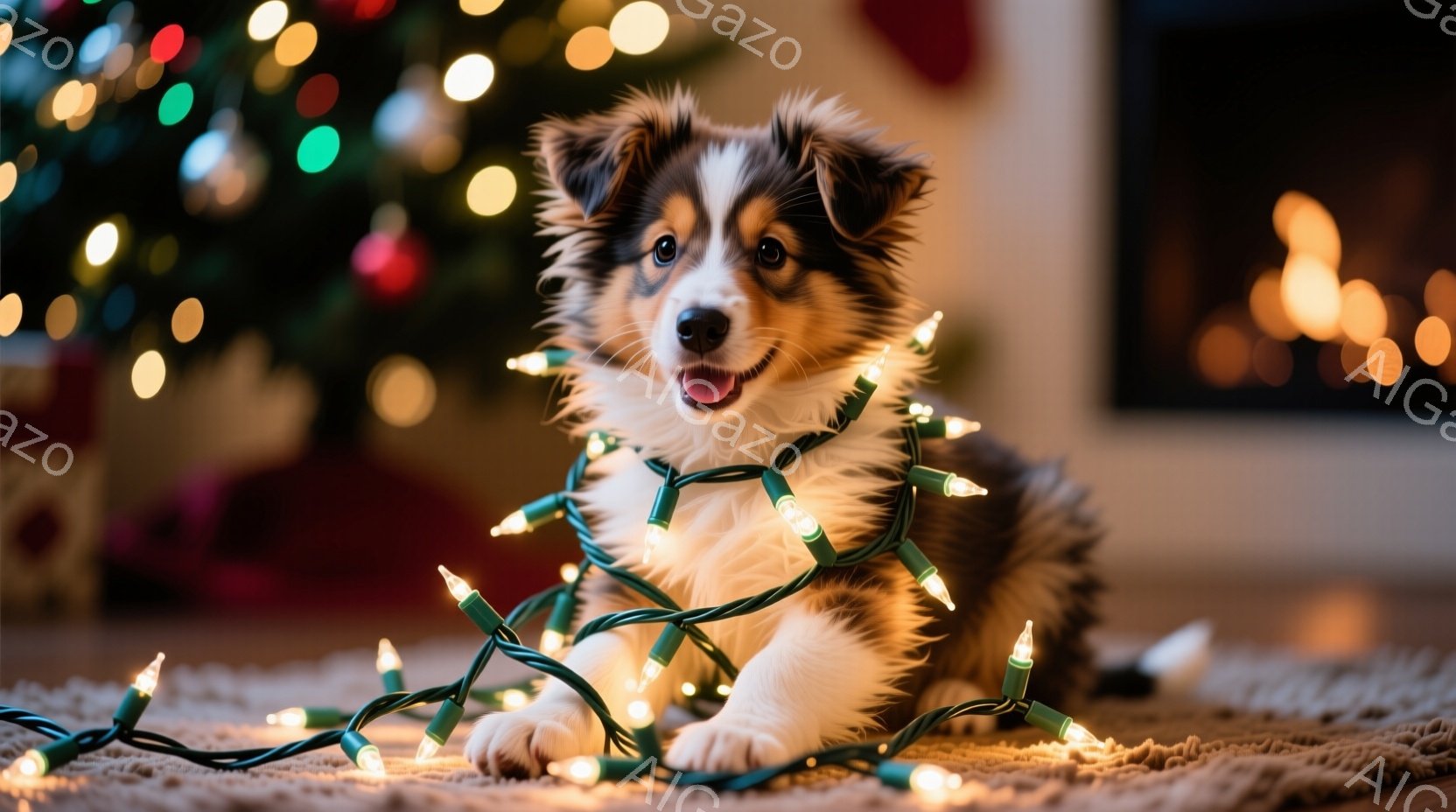 ゴールデンカラーと白の毛並みを持つ子犬が、クリスマスのイルミネーションライトに包まれて絨毯の上に横たわっています。子犬は前足を伸ばし、穏やかな表情でカメラを見つめており、背景にはぼやけたクリスマスツリーと暖炉が見えます。暖炉の光とイルミネーションライトが、温かく、お祝いの雰囲気を醸し出しています。