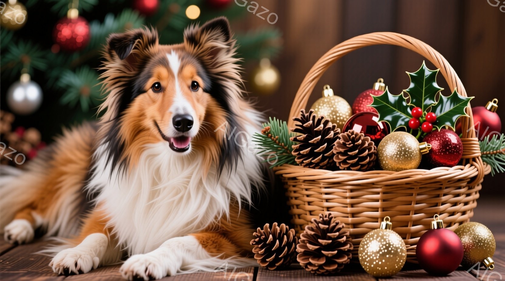 鮮やかな赤と白の毛並みを持つコリー犬が、木製の床に横たわっています。その隣には、松ぼっくりや赤いクリスマスオーナメントが入った編み込みのバスケットが置かれています。背景には緑色のクリスマスツリーが見え、暖かく、お祝いの雰囲気を醸し出しています。
