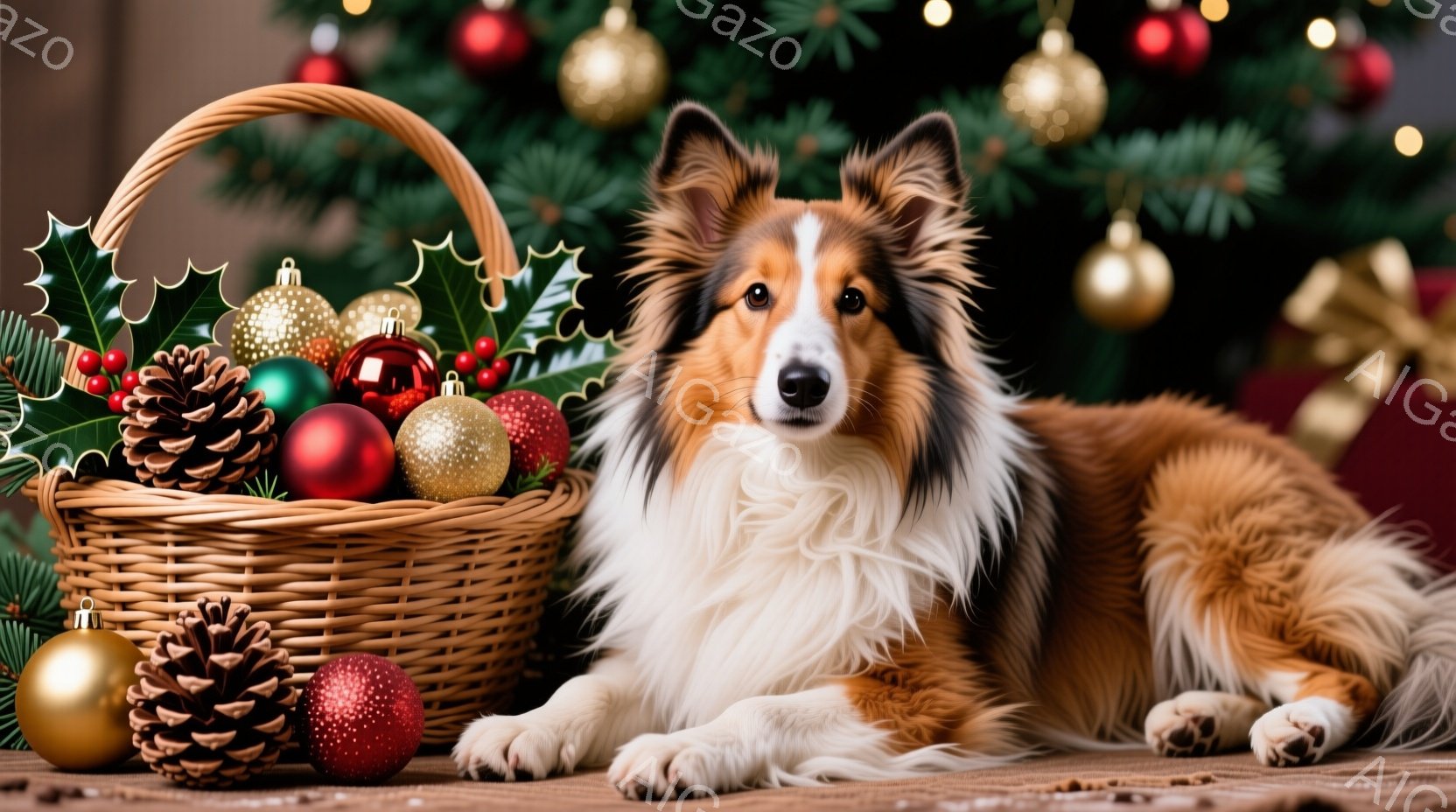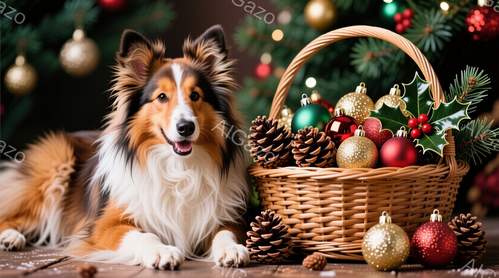 コリー犬が木製の床に横たわり、隣には松ぼっくりとクリスマスオーナメントでいっぱいの籐のバスケットがあります。犬は茶色と白の毛並みで、穏やかでリラックスした表情をしています。背景にはぼやけたクリスマスツリーと光が散りばめられ、温かくお祝いの雰囲気を醸し出しています。