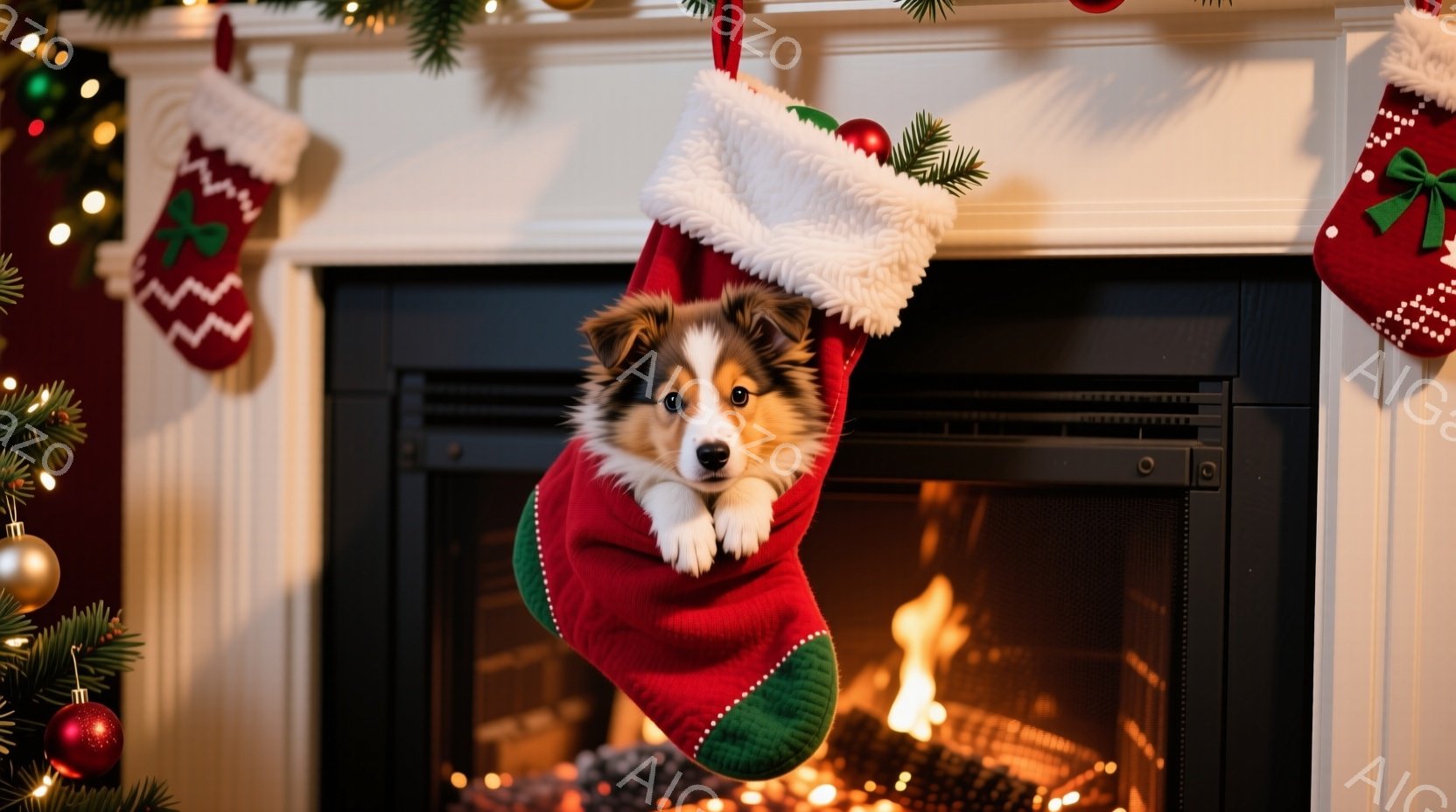 クリスマスソックスの中に、小さな茶色と白の犬が顔を出しています。犬は前足を出してソックスの縁につかまり、好奇心と遊び心にあふれた表情をしています。背景には、暖炉の火、クリスマスツリーの飾り、プレゼントの箱が見え、温かくお祝いムードに包まれたクリスマスの雰囲気を感じさせます。