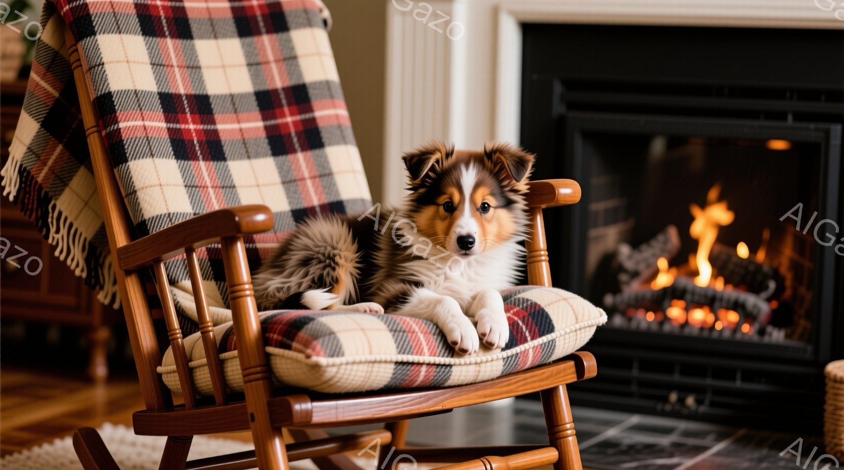 明るい茶色のロッキングチェアに、ふわふわの茶色と白の毛並みを持つ子犬がゆったりと横たわっています。背景には暖炉があり、炎が暖かく光っており、部屋全体に居心地の良い雰囲気を作り出しています。ロッキングチェアにはチェック柄のブランケットがかかっており、さらにリラックスした印象を与えています。