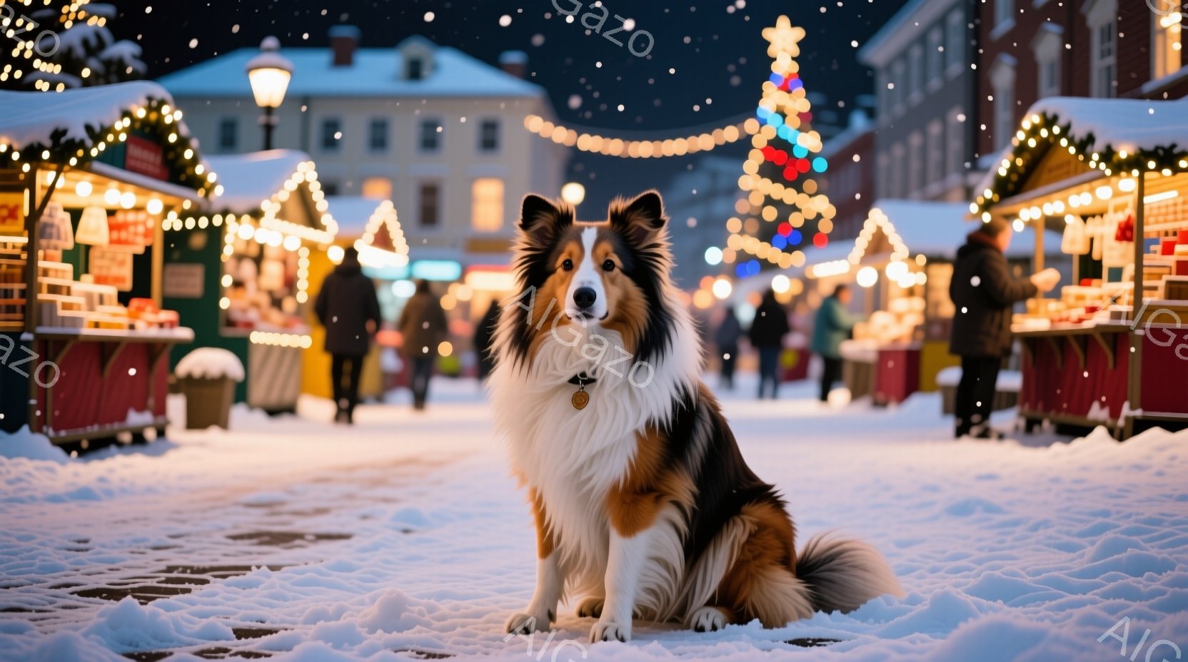 白と茶色のボーダーコリーが雪に覆われた石畳の道に座っています。背景には、クリスマスマーケットの屋台が並び、暖かい光が灯っており、多くの人々が歩き回っています。全体的に、冬の夜の温かく、お祭り気分な雰囲気で、雪が舞い散っています。