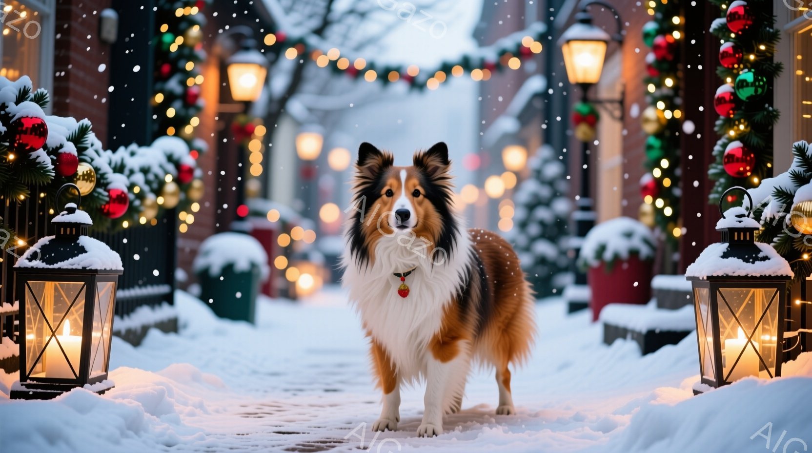 雪に覆われた石畳の道に、トライカラーのシェットランドシープドッグが堂々と立っている。背景には、クリスマス装飾が施された建物が並び、暖かく灯ったランタンやクリスマスツリーが冬の景色を彩っている。雪が舞い、温かく穏やかなクリスマスの雰囲気が漂う。