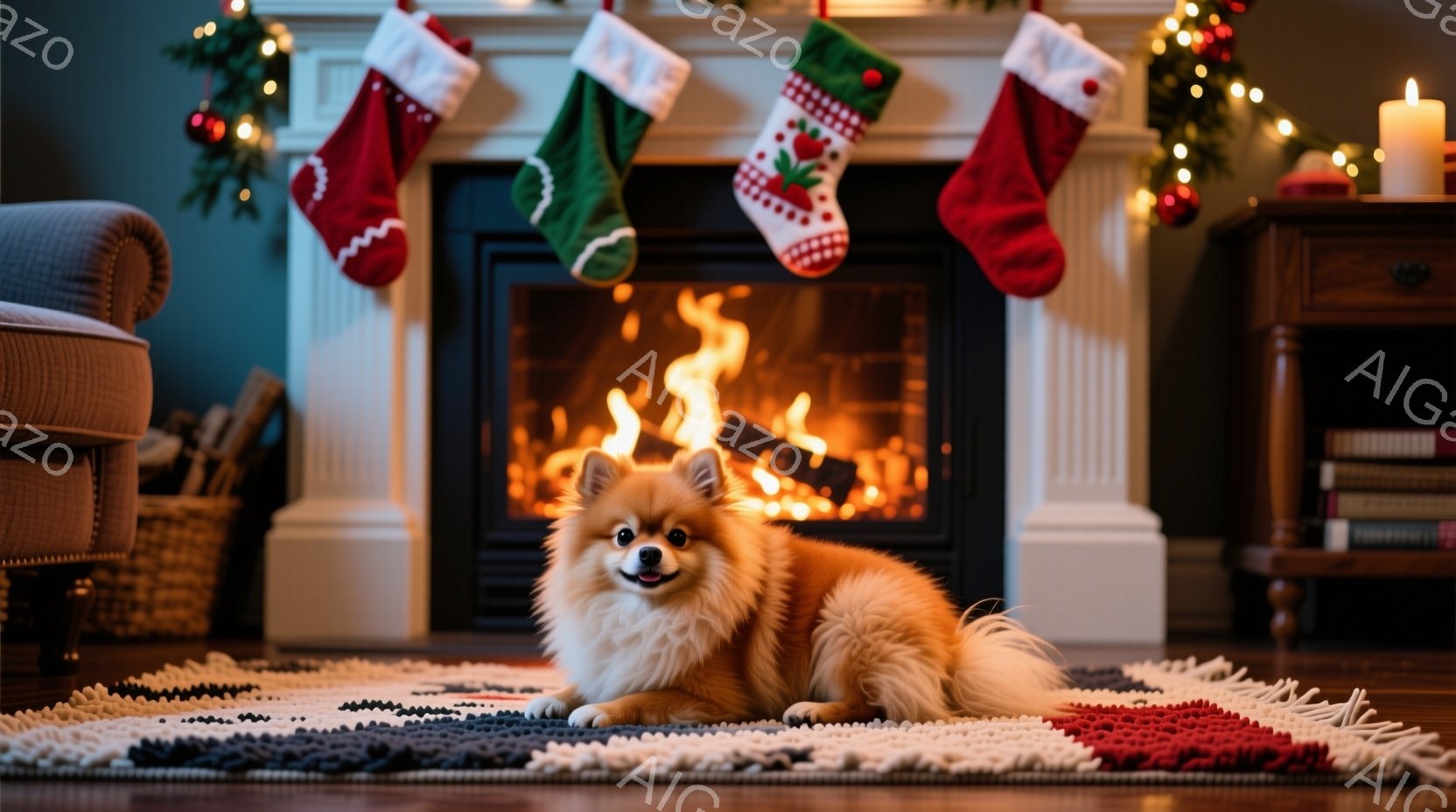 ポメラニアン犬が、暖炉の前に敷かれた赤い絨毯の上でリラックスして横たわっています。暖炉は火が灯っており、クリスマスの飾り付けが施されたマントルピースと、赤いクリスマスストッキングが暖かさと居心地の良い雰囲気を醸し出しています。部屋全体が温かい光に包まれ、冬のホリデーシーズンを思わせる穏やかな雰囲気です。