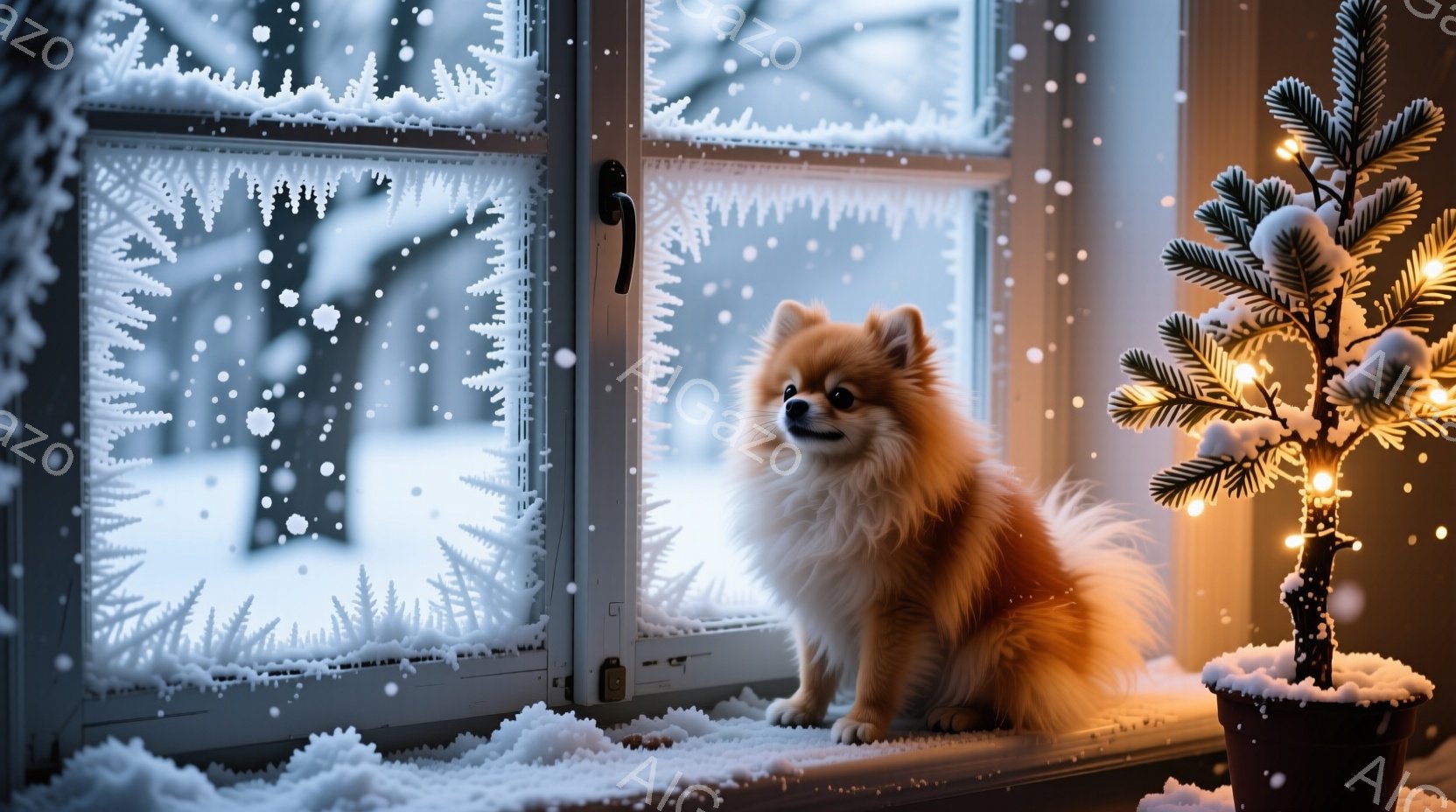 白い窓枠に座っている、ふわふわの茶色のポメラニアンが写っています。雪が降る外を眺めており、その表情は穏やかで、少し寂しげにも見えます。背景には雪で覆われた庭と、キラキラと光る小さなクリスマスツリーがあり、温かく幻想的な冬の雰囲気が漂っています。
