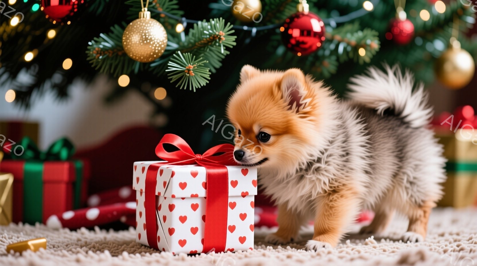 蓬ふわとした毛並みの茶色と黒の小型犬が、クリスマスプレゼントのラッピングされた箱に鼻を近づけています。背景にはクリスマスツリーの緑と、赤や金色のオーナメントが輝き、プレゼントボックスがいくつか置かれています。全体的に暖かく、愛らしいクリスマスの雰囲気が漂っています。