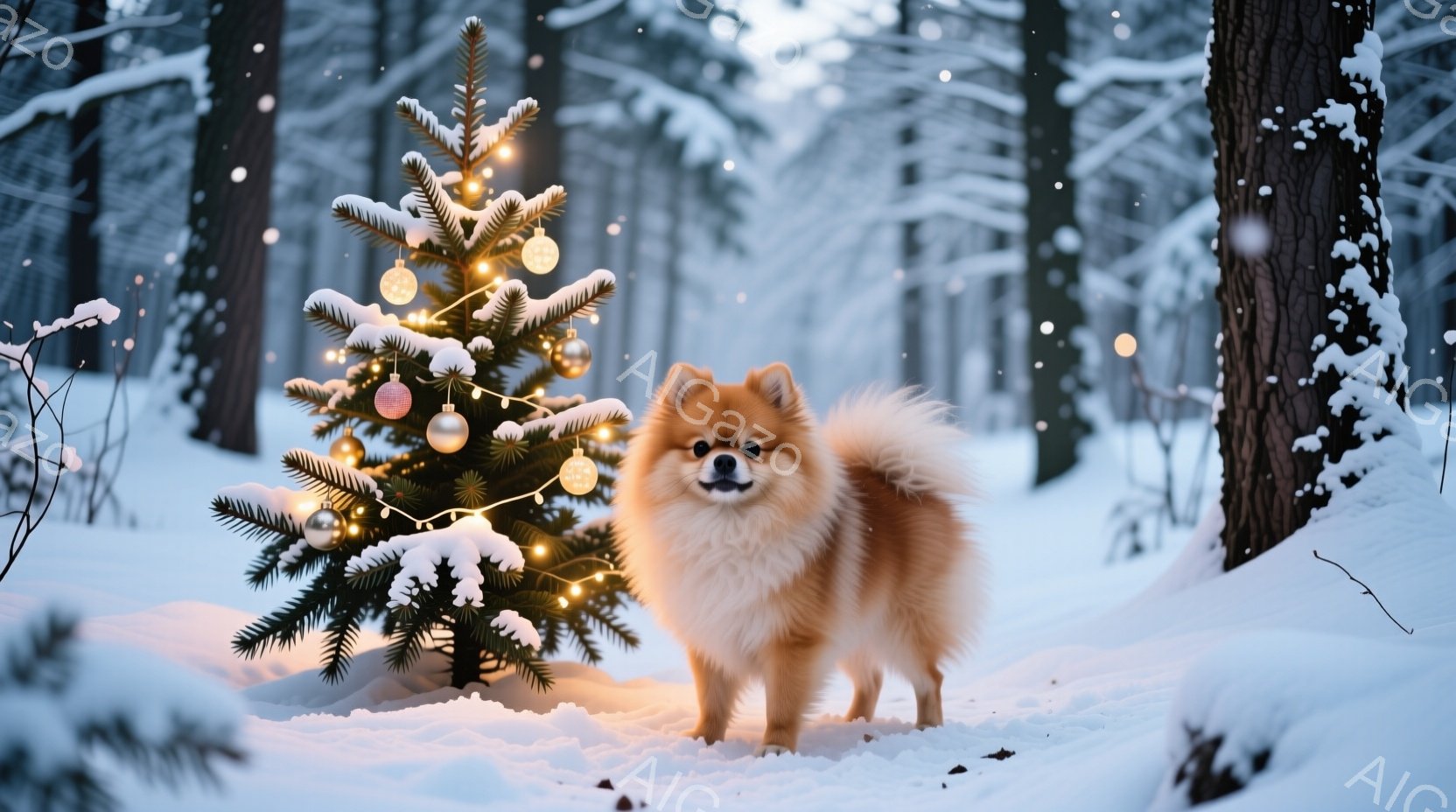ふわふわの茶色のポメラニアンが、雪景色の中でクリスマスツリーの隣に立っている。ツリーはオーナメントで飾られ、雪が積もった地面と背景の暗い木々とのコントラストが美しい。全体的に暖かく、お祝いの雰囲気が漂う、冬の静寂を描いた写真である。