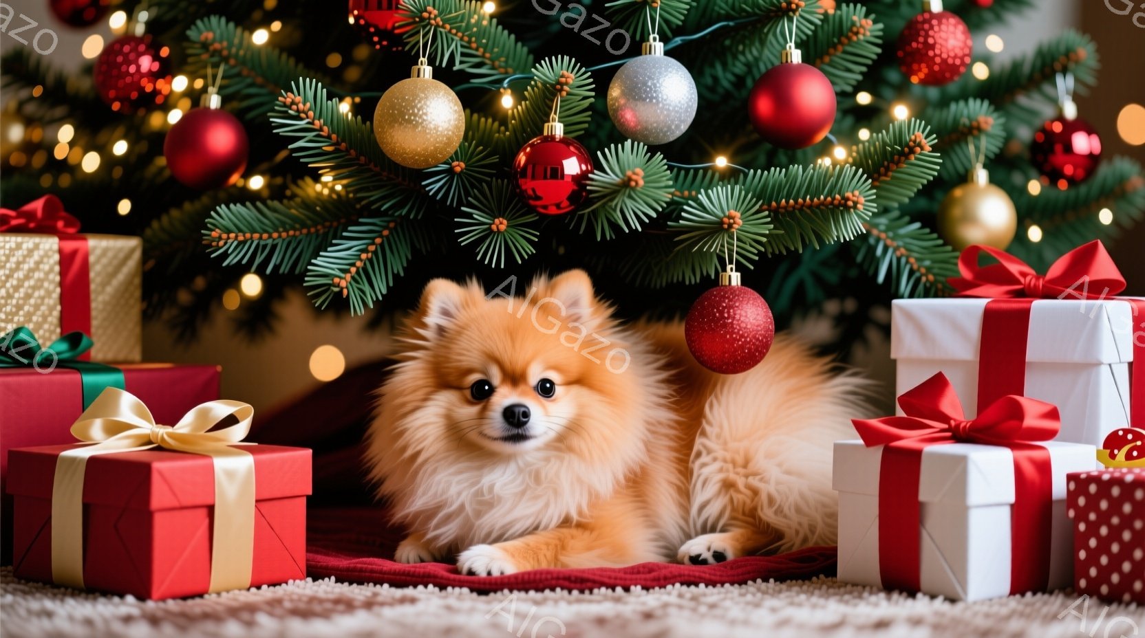 ポメラニアンがクリスマスツリーの下、プレゼントの山の中に座っています。犬はオレンジ色の毛並みで、少し微笑んでいるように見え、リラックスした姿勢です。背景には緑のクリスマスツリーと、赤、金、白の装飾がされたプレゼントボックスが並び、暖かく華やかなクリスマスの雰囲気が漂っています。