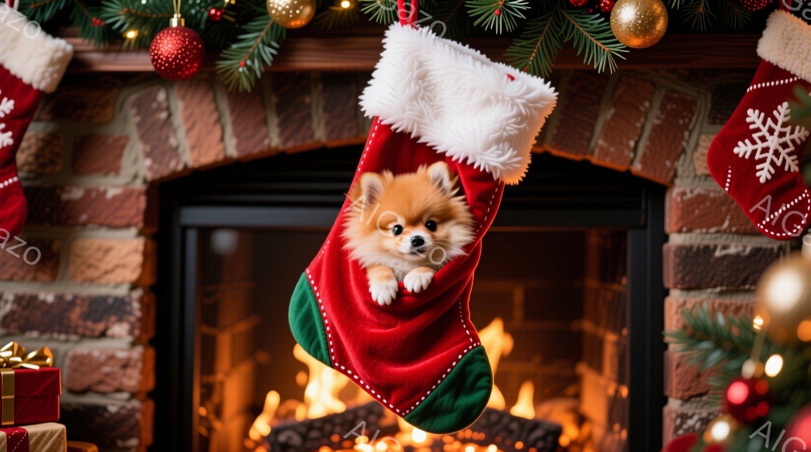 真っ赤なクリスマスストッキングの中に、ふわふわの茶色のポメラニアンの子犬がちょこんと座っています。子犬は前足をストッキングの縁から出して、好奇心旺盛な表情でこちらを見ています。背景には、暖炉の火が灯り、クリスマスツリーの飾りや他のストッキングが飾られ、温かく幸せなクリスマスの雰囲気が漂っています。