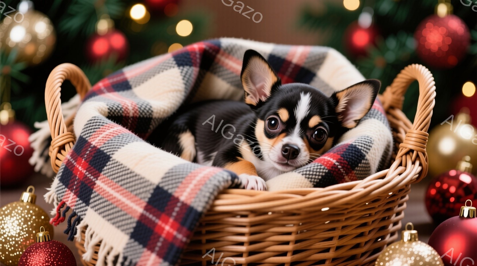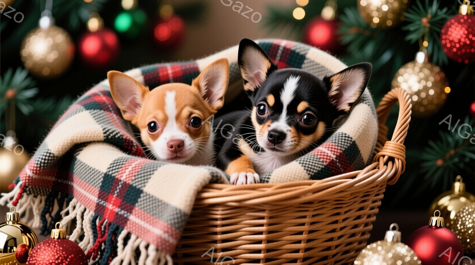 籠の中に二匹のチワワが寄り添って入っています。片方のチワワはクリーム色、もう片方は黒と白の模様で、どちらも大きな瞳でカメラを見ており、とても可愛らしい表情をしています。背景にはクリスマスツリーとオーナメントがあり、温かく、お祝いムード満点の雰囲気です。