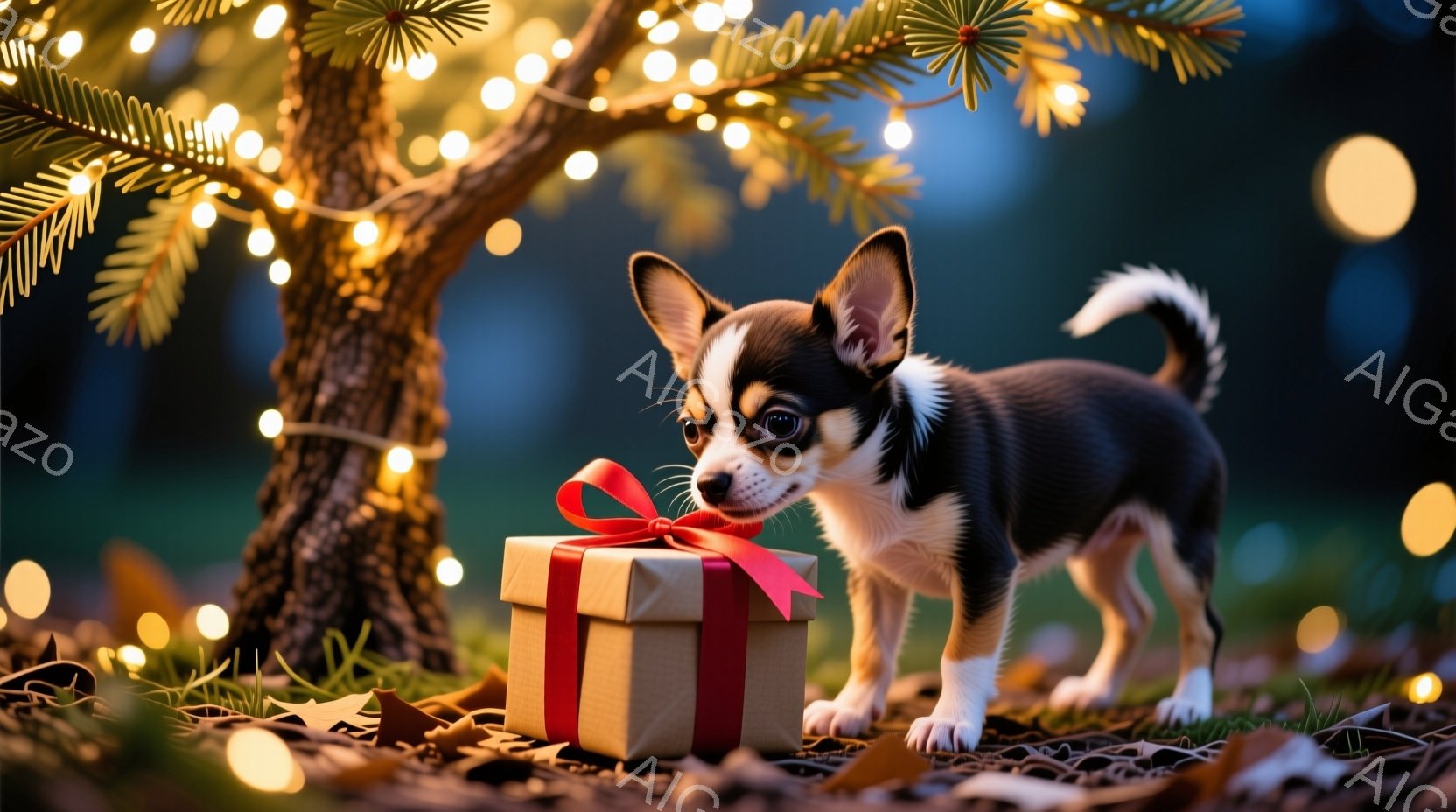 白と黒の毛並みをした小さなチワワが、赤いリボンで飾られた白いプレゼントボックスの前に立ち、興味津々とした表情で箱を見つめています。背景にはクリスマスの飾り付けが施されたクリスマスツリーがあり、ぼやけた赤いオーナメントとキラキラと輝く電飾が暖かく華やかな雰囲気を醸し出しています。全体的に、この画像は、クリスマスの喜びと、小さな犬の愛らしさが溢れる、心温まる光景を捉えています。