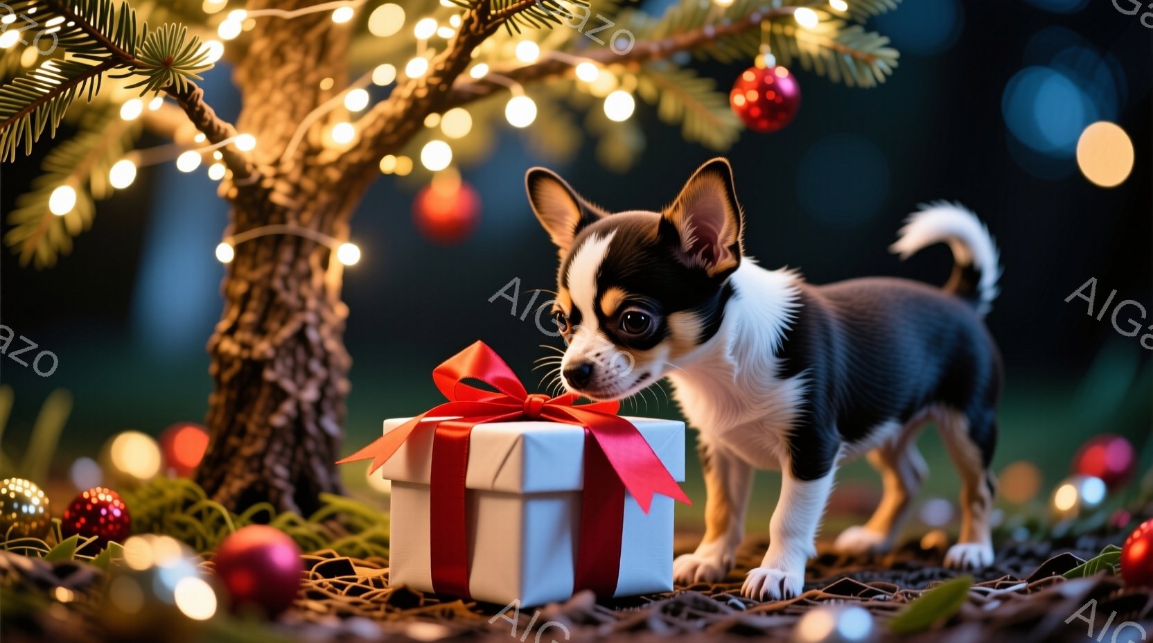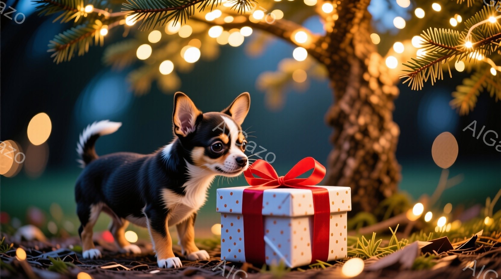 小さなチワワが白いリボンのかかったギフトボックスの前に立っている。その犬は好奇心旺盛な表情で箱を覗き込んでおり、片方の前足はわずかに伸ばして箱に近づこうとしている。背景にはぼやけた緑の木々と、暖かい光を放つたくさんのキラキラした電飾があり、祝祭的で穏やかな雰囲気を醸し出している。