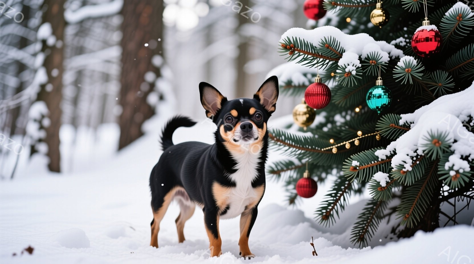 黒と白の毛並みを持つチワワが、赤いリボンで飾られた白いギフトボックスの前に立っている。背景にはぼやけた木々と、暖かく輝くクリスマスツリーのライトが見え、穏やかで祝祭的な雰囲気を醸し出している。犬は少し前かがみになり、ギフトボックスに興味津々な表情を浮かべている。
