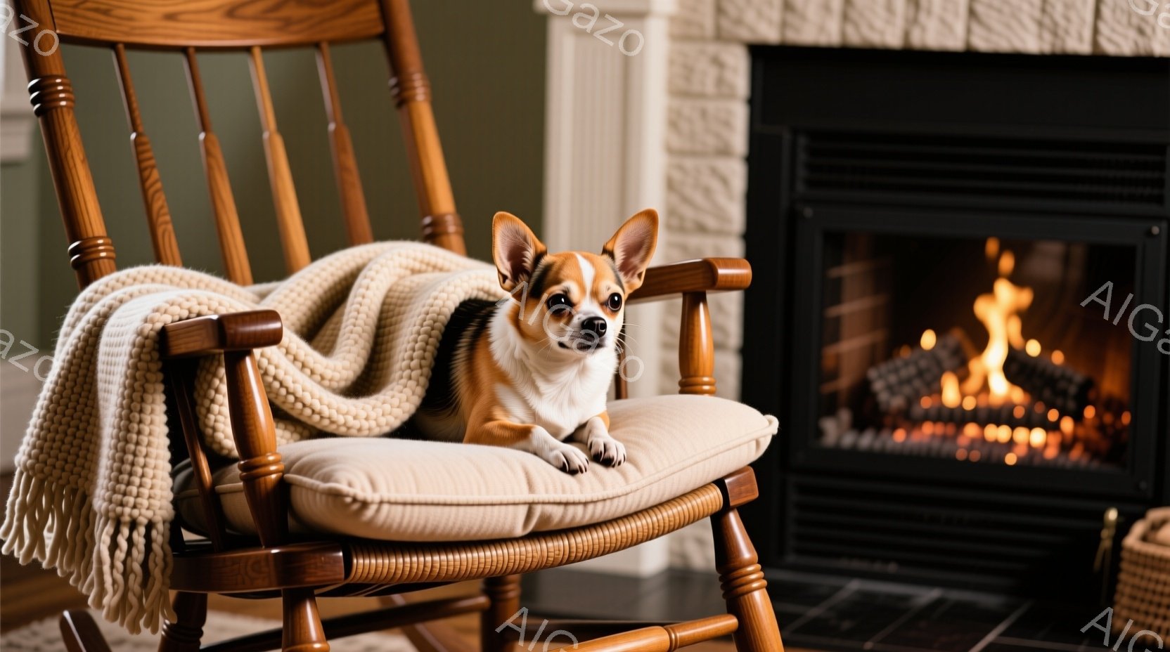温かみのある室内で、小さな茶色と白のチワワがロッキングチェアに座ってこちらを見ています。椅子にはオフホワイトの毛布がかけられており、背景には暖炉の火が燃え盛っています。全体的に、穏やかでリラックスした、家庭的な雰囲気を感じさせます。