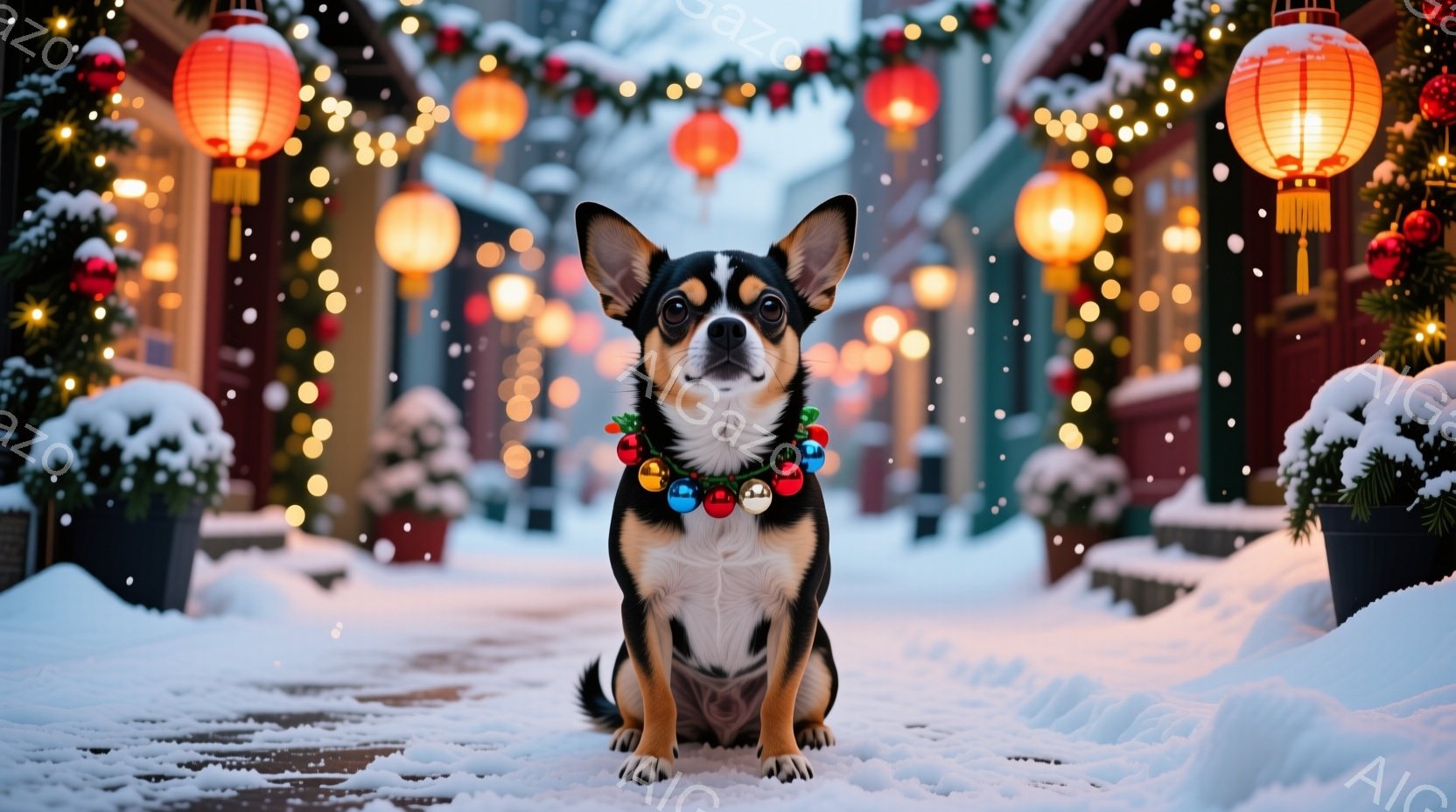 雪が降る街並みに、黒と白のチワワが座っています。赤い首輪をつけており、まっすぐ前を見つめて凛々しい表情をしています。背景にはクリスマス装飾が施された建物や植物、そして温かい光を放つ提灯が並び、冬の暖かく幻想的な雰囲気を醸し出しています。