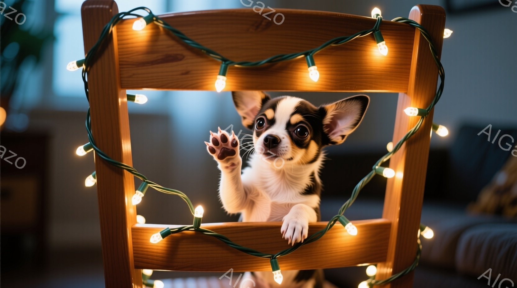 白と黒の毛並みを持つ小さなチワワが、クリスマスツリーのイルミネーションライトに囲まれた木の椅子の上で、前足を上げて何かを訴えるようにしています。背景はぼやけていますが、室内であることが分かります。全体的に、愛らしくて遊び心のある、温かい雰囲気が漂っています。