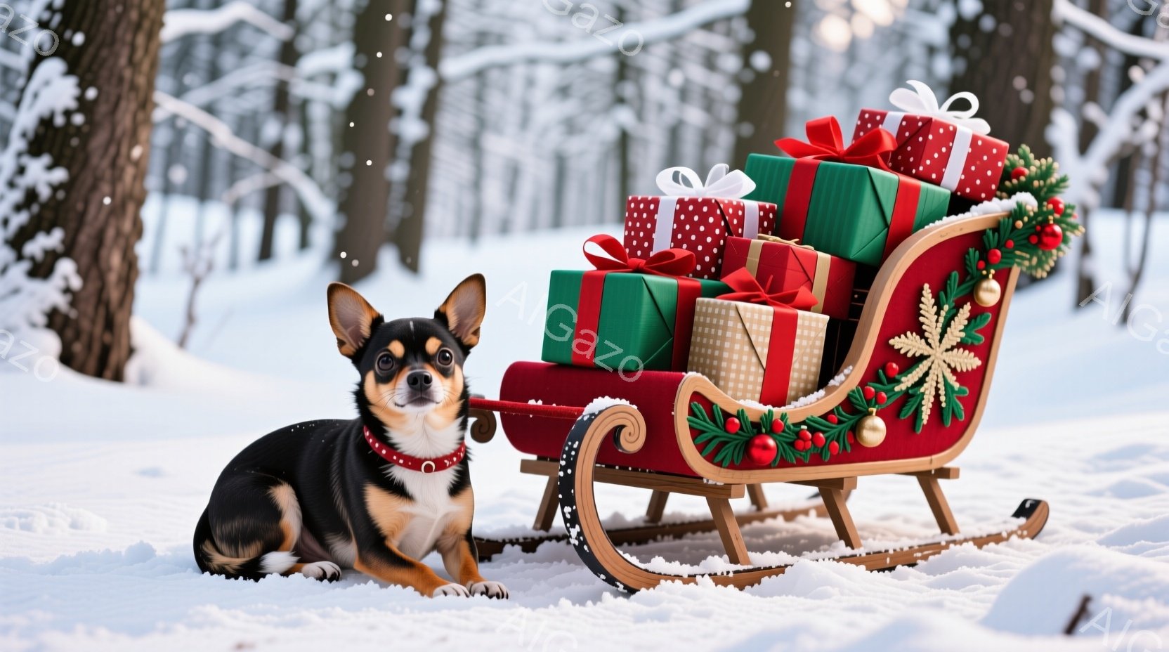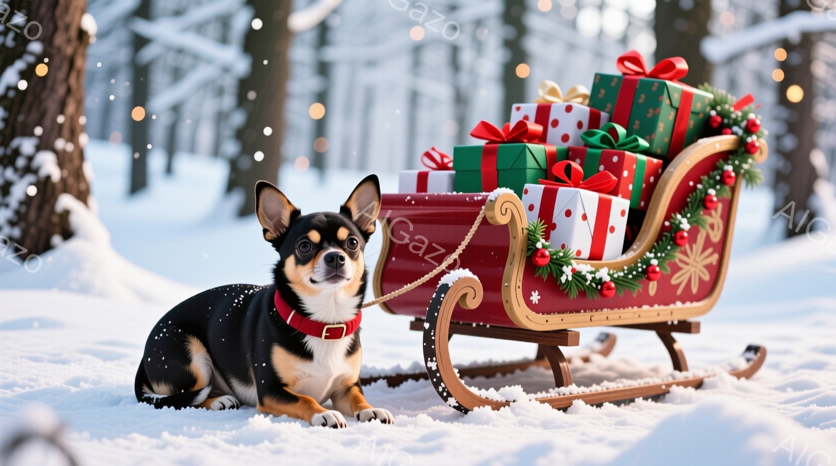 黒と白の毛並みの小型犬が雪の上に座り、赤い首輪をしています。その前には、カラフルな包装紙で飾られたプレゼントが積み込まれた赤いそりが置かれています。背景は雪に覆われた木々で、冬の静かで祝祭的な雰囲気を醸し出しています。