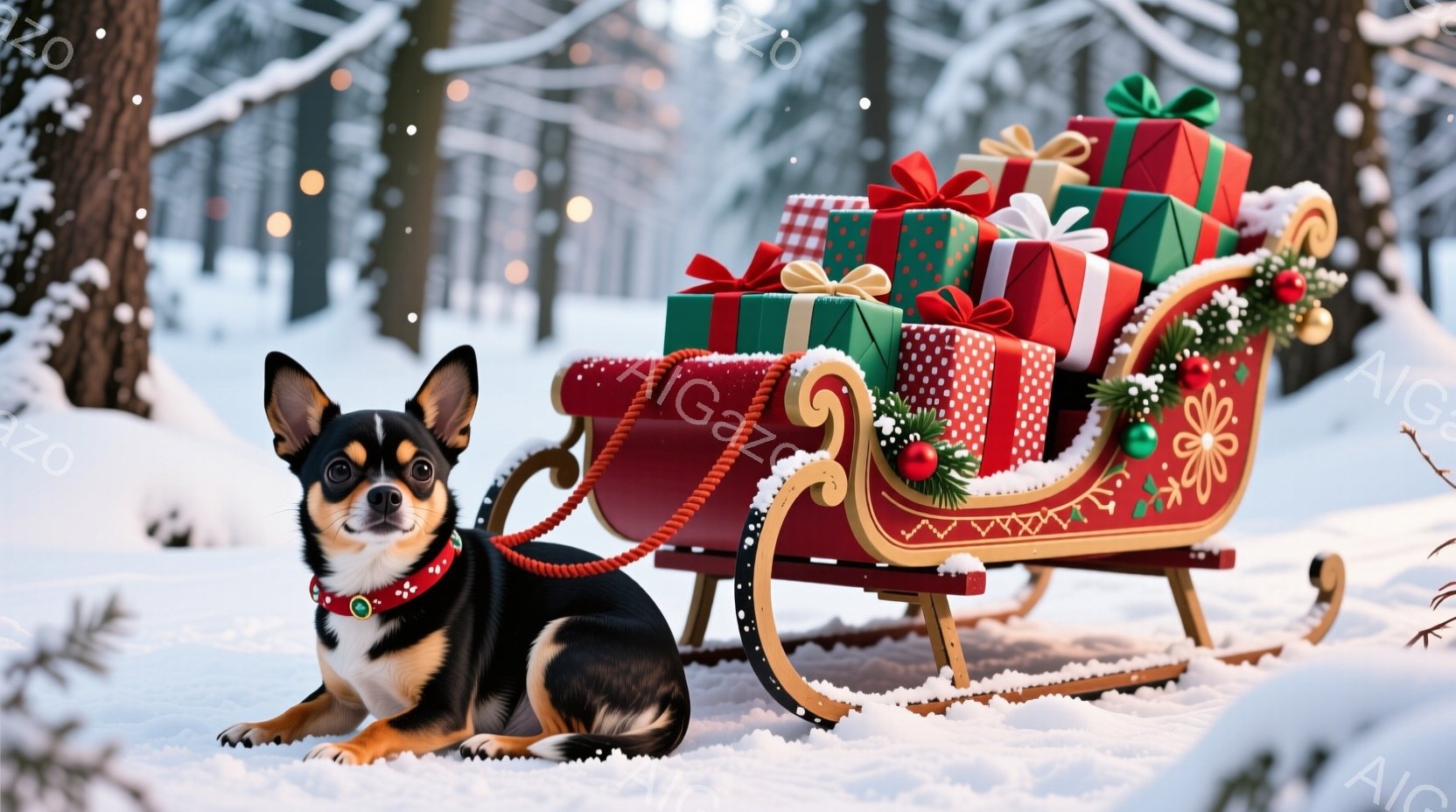 黒とタンの毛並みを持つチワワが、雪の上に座り、赤い首輪をつけています。その隣には、クリスマスプレゼントでいっぱいの赤いそりが置かれており、緑のガーランドと装飾で飾られています。背景は雪に覆われた森で、冬の穏やかで祝祭的な雰囲気を醸し出しています。