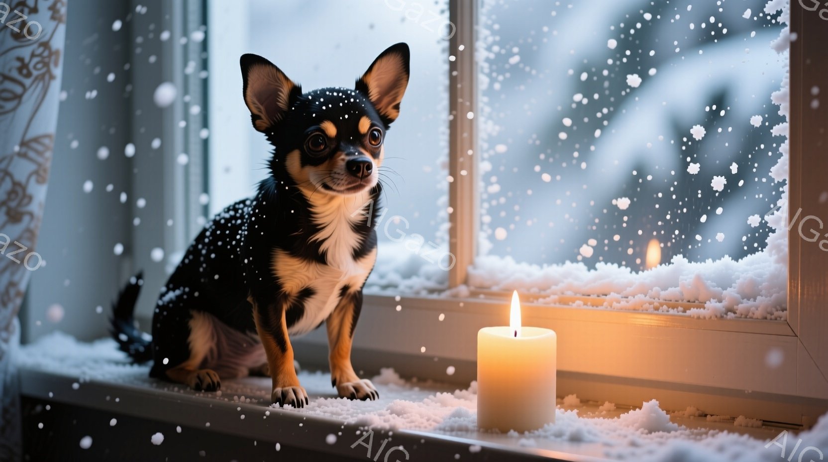 小さなチワワが雪の降る窓辺に座っています。窓枠には雪が積もり、近くには灯されたキャンドルが温かい光を放っています。チワワは少し不安そうな表情で遠くを見つめ、冬の静かで穏やかな雰囲気が漂っています。