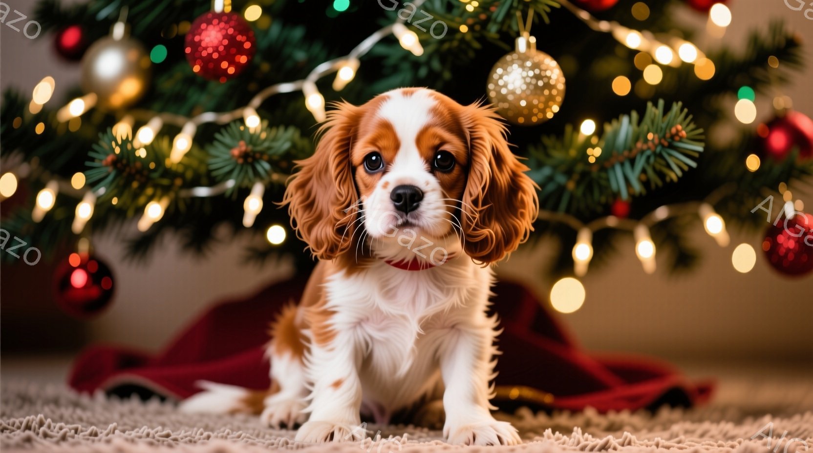 白と茶色の毛並みの小さな子犬が、赤い布と緑のクリスマスツリーの前で座っています。子犬は真っ直ぐ前を見ており、愛らしい表情をしています。背景にはぼやけたクリスマスツリーの飾りと光があり、温かくお祝いムードが漂っています。